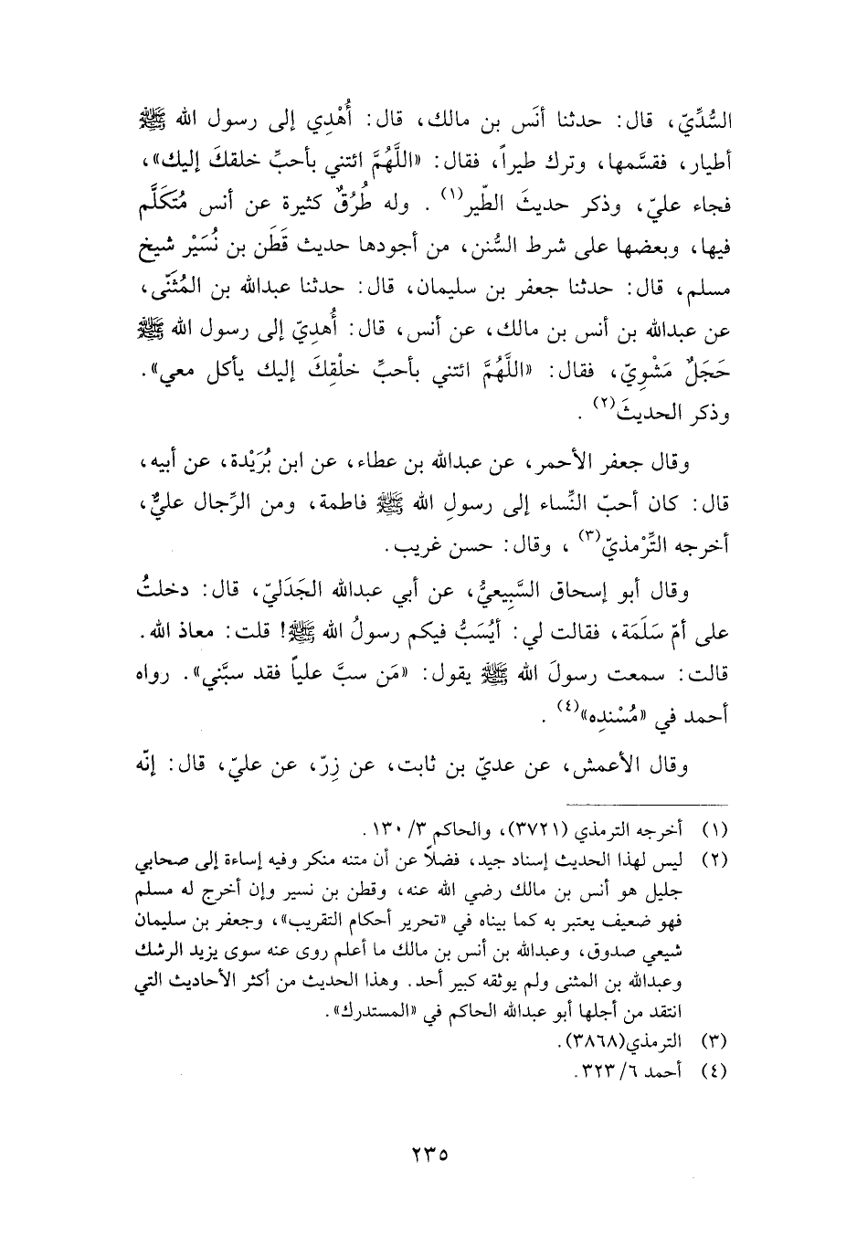 متكلم فيها، وبعضها على شرط السنن، من أجودها حديث قطن بن نسير شيخ مسلم، قال: حدثنا جعفر بن سليمان، قال: حدثنا عبد الله بن المثنى، عن عبد الله بن أنس بن مالك، عن أنس، قال: أهدي إلى رسول الله صلى الله عليه وسلم حجل مشوي، فقال: "اللهم ائتني بأحب خلقك إليك يأكل معي". وذكر الحديث.