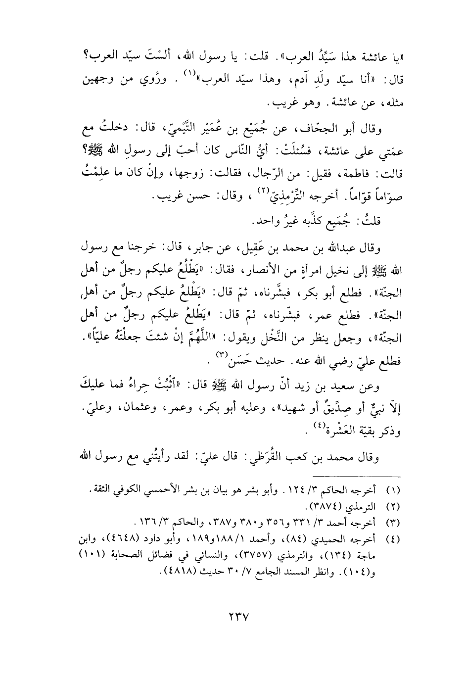 "يا عائشة هذا سيد العرب". قلت: يا رسول الله، ألست سيد العرب؟ قال: "أنا سيد ولد آدم، وهذا سيد العرب". وروي من وجهين مثله عن عائشة. وهو غريب.