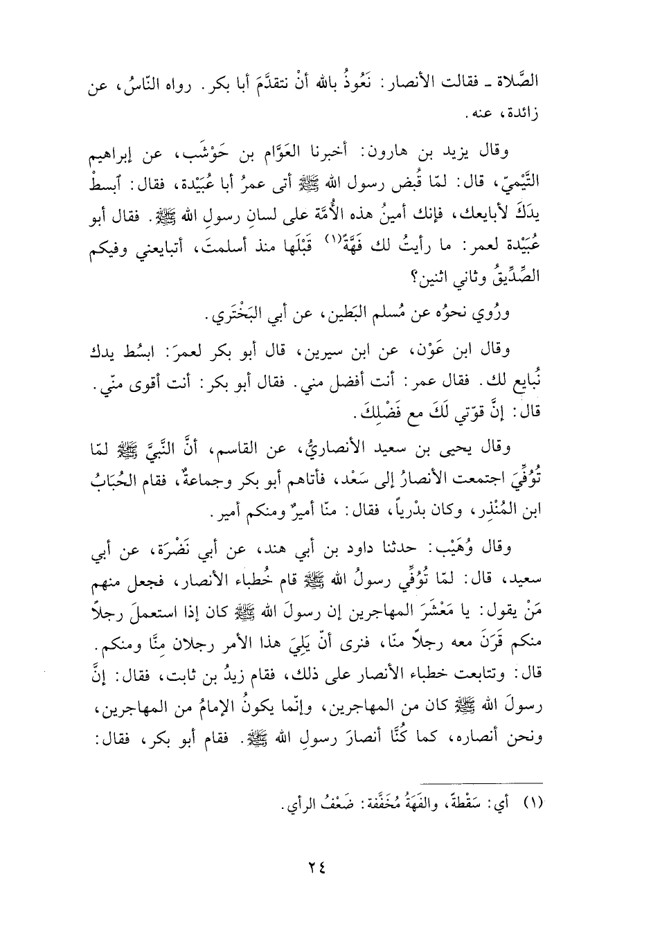 وقال وهيب: حدثنا داود بن أبي هند، عن أبي نضرة، عن أبي سعيد، قال: لما توفي رسول الله صلى الله عليه وسلم قام خطباء الأنصار، فجعل منهم من يقول: يا معشر المهاجرين إن رسول الله صلى الله عليه وسلم كان إذا استعمل رجلا منكم قرن معه رجلا منا، فنرى أن يلي هذا الأمر رجلان منا ومنكم. قال: وتتابعت خطباء الأنصار على ذلك، فقام زيد بن ثابت فقال: إن رسول الله صلى الله عليه وسلم كان من المهاجرين، وإنما يكون الإمام من المهاجرين، ونحن أنصاره، كما كنا أنصار رسول الله صلى الله عليه وسلم. فقام أبو بكر، فقال:
