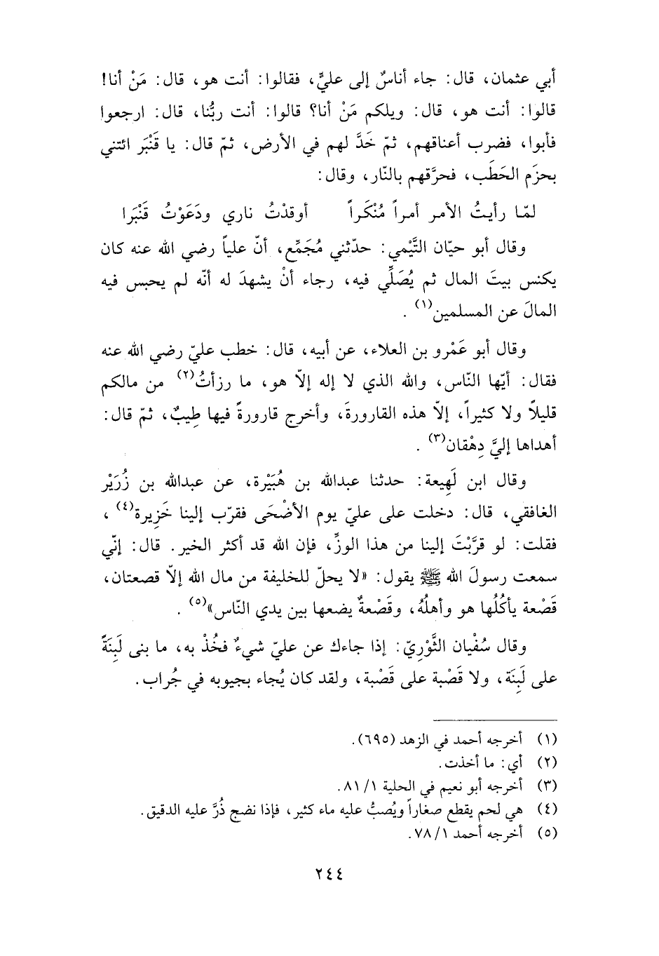 أبي عثمان، قال: جاء أناس إلى علي، فقالوا: أنت هو، قال: من أنا! قالوا: أنت هو، قال: ويلكم من أنا؟ قالوا: أنت ربنا، قال: ارجعوا فأبوا، فضرب أعناقهم، ثم خد لهم في الأرض، ثم قال: يا قنبر ائتني بحزم الحطب، فحرقهم بالنار، وقال: