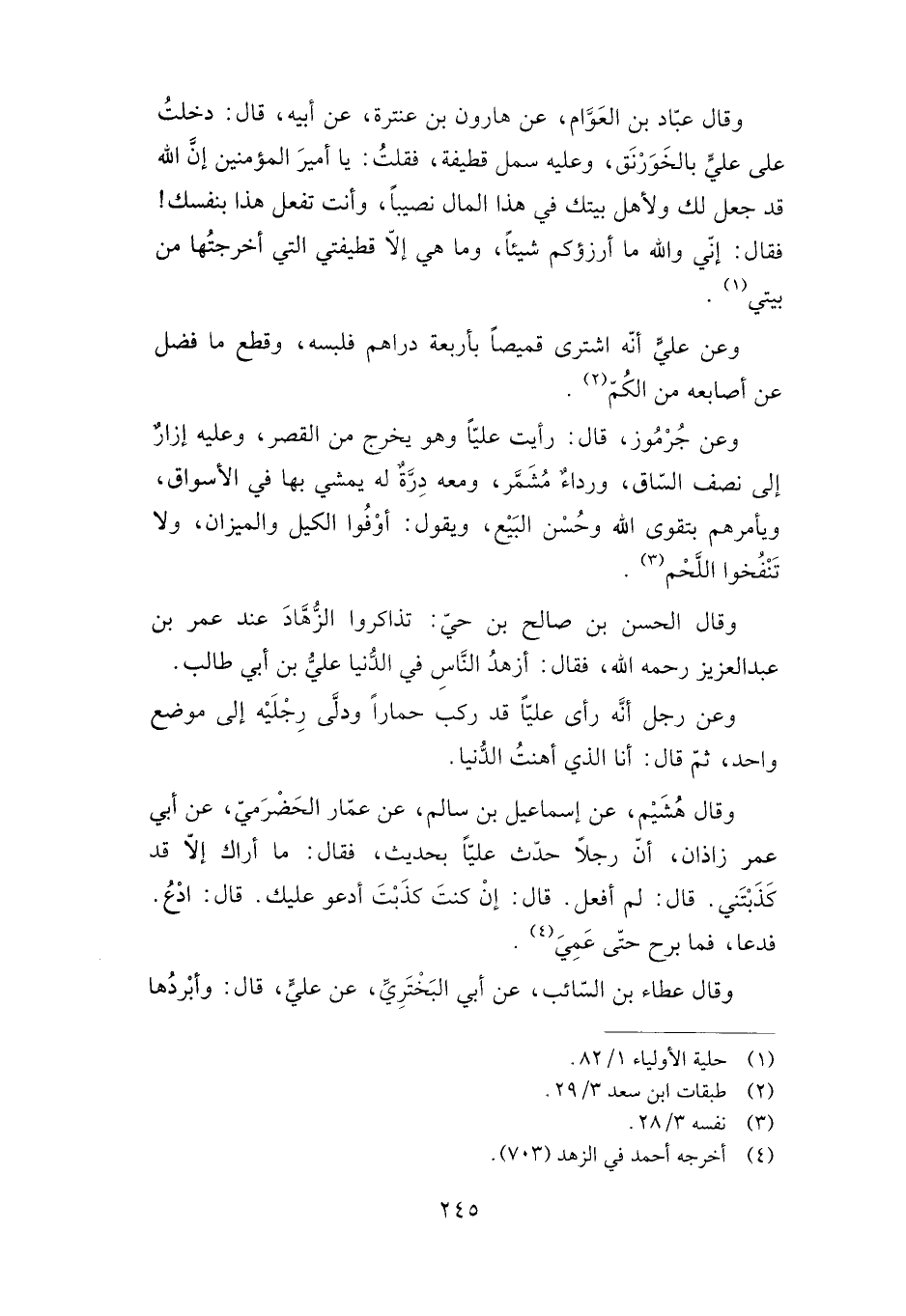 وقال عباد بن العوام، عن هارون بن عنترة، عن أبيه، قال: دخلت على علي بالخورنق، وعليه سمل قطيفة، فقلت: يا أمير المؤمنين إن الله قد جعل لك ولأهل بيتك في هذا المال نصيبا، وأنت تفعل هذا بنفسك! فقال: إني والله ما أرزؤكم شيئا، وما هي إلا قطيفتي التي أخرجتها من بيتي.