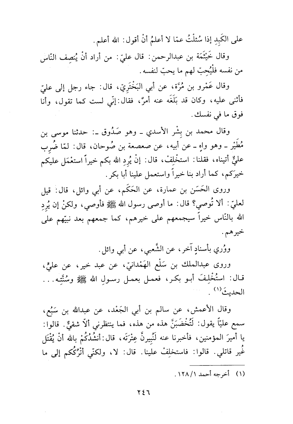 أبيه، عن صعصعة بن صوحان، قال: لا ضرب علي أتيناه، فقلنا: استخلف، قال: إن يرد الله بكم خيرًا استعمل عليكم خيركم، كما أراد بنا خيرا واستعمل علينا أبا بكر.