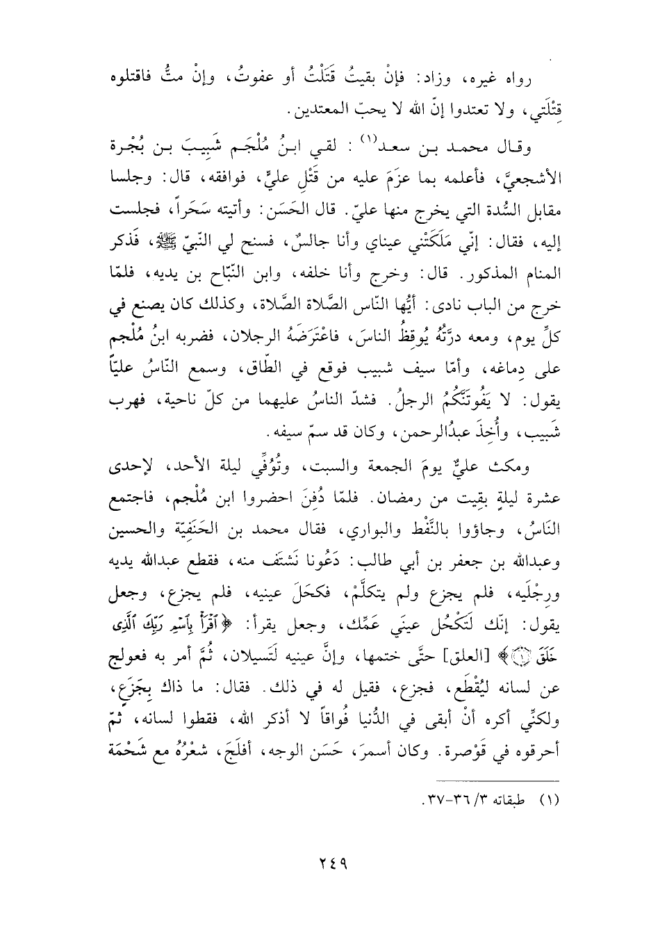 وقال محمد بن سعد: لقي ابن ملجم شبيب بن بجرة الأشجعي، فأعلمه بما عزم عليه من قتل علي، فوافقه، قال: وجلسا مقابل السدة التي يخرج منها علي. قال الحسن: وأتيته سحرا فجلست إليه، فقال: إني ملكتني عيناي وأنا جالس، فسنح لي النبي صلى الله عليه وسلم، فذكر المنام المذكور قال: وخرج وأنا خلفه، وابن النباح بن يديه، فلما خرج من الباب نادى: أيها الناس