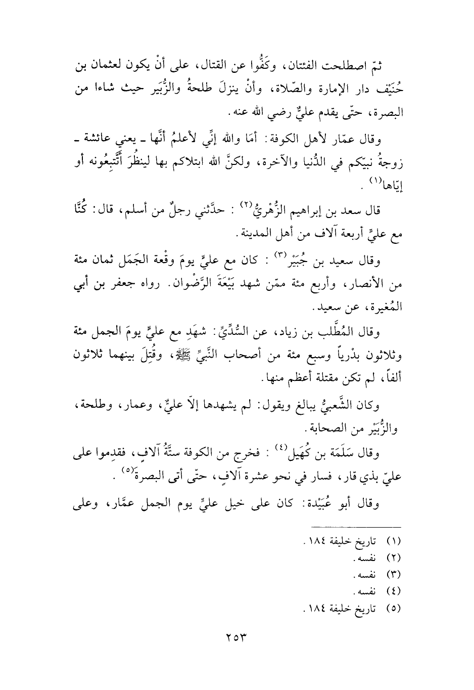 وقال سعيد بن جبير: كان مع علي يوم وقعة الجمل ثمان مائة من الأنصار، وأربع مائة ممن شهد بيعة الرضوان. رواه جعفر بن أبي المغيرة، عن سعيد.