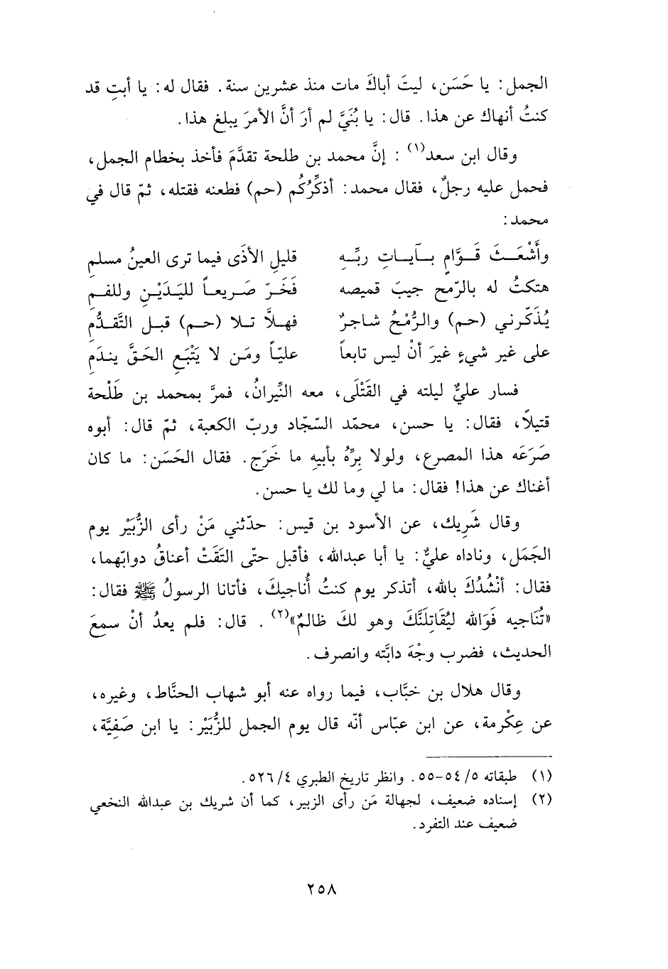وقال ابن سعد: إن محمد بن طلحة تقدم فأخذ بخطام الجمل، فحمل عليه رجل، فقال محمد: أذكركم "حم" فطعنه فقتله، ثم قال في محمد: