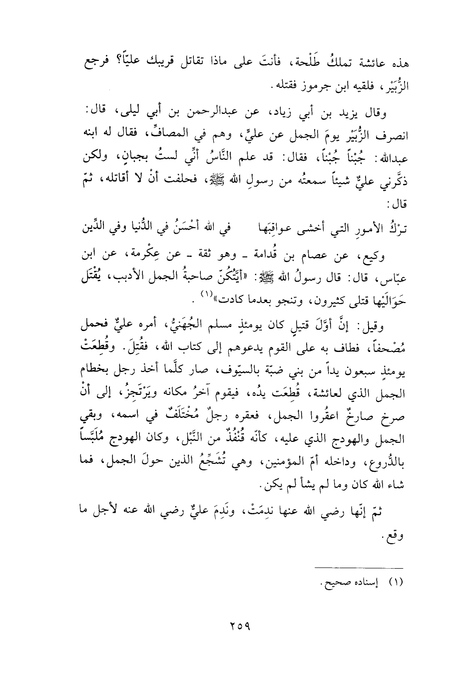 هذه عائشة تملك طلحة، فأنت على ماذا تقاتل قريبك عليًّا؟ فرجع الزبير، فلقيه ابن جرموز فقتله.