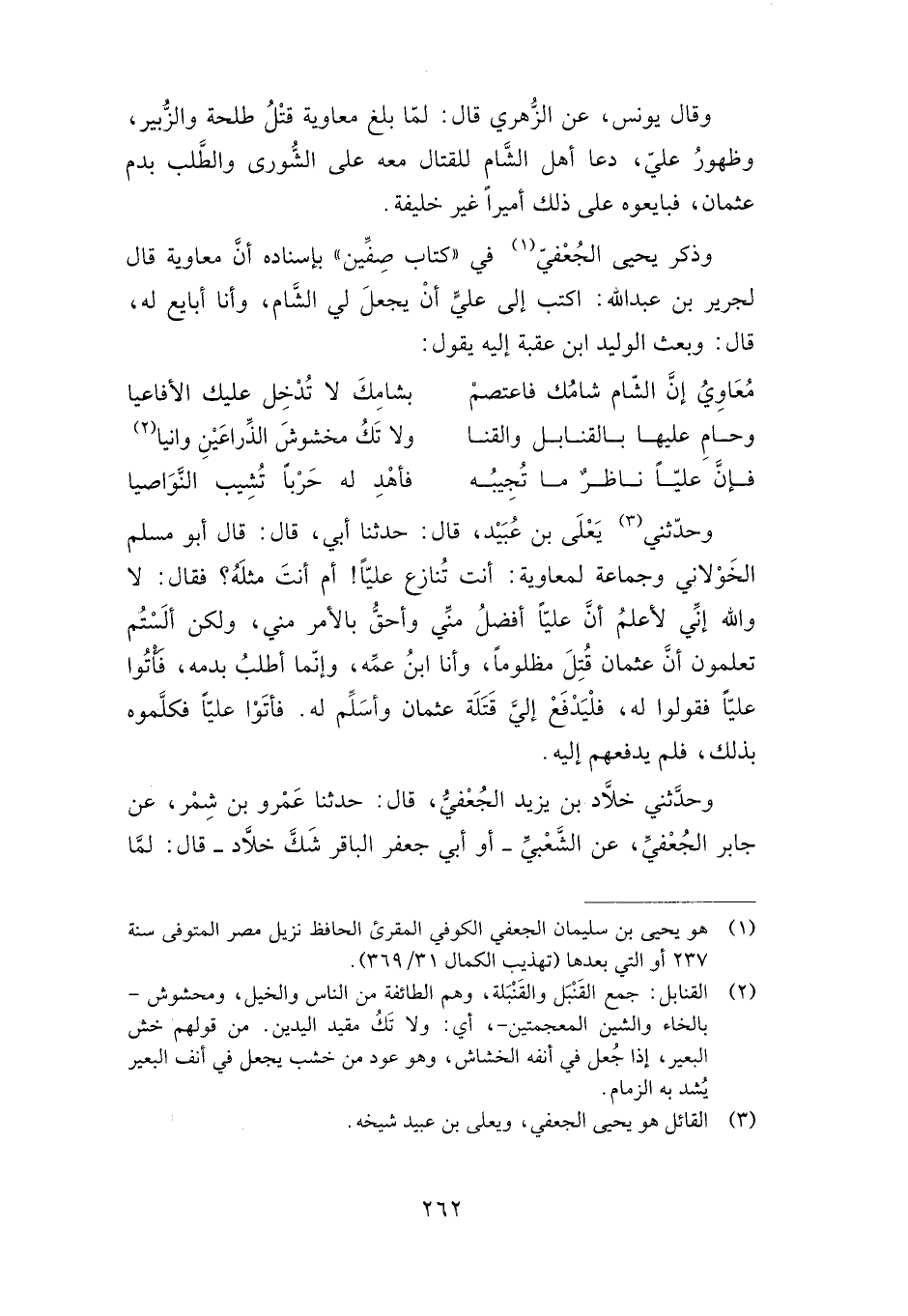 وذكر يحيى الجعفي في "كتاب صفين" بإسناد أن معاوية قال لجرير بن عبد الله: اكتب إلى علي أن يجعل لي الشام، وأنا أبايع له، قال: وبعث الوليد بن عقبة إليه يقول: