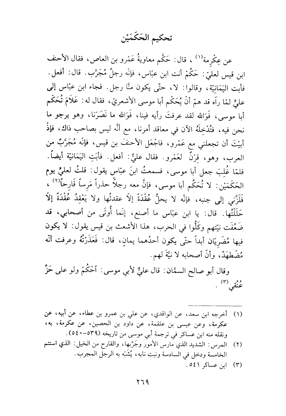 عن عكرمة قال: حكم معاوية عمرو بن العاص، فقال الأحنف بن قيس لعلي: حكم أنت ابن عباس، فإنه رجل مجرب. قال: أفعل. فأبت اليمانية، وقالوا: لا، حتى يكون منا رجل. فجاء ابن عباس إلى علي لما رآه قد هم أن يحكم أبا موسى الأشعري، فقال له: علام تحكم أبا موسى، فوالله لقد عرفت رأيه فينا، فوالله ما نصرنا، وهو يرجو ما نحن فيه، فتدخله الآن في معاقد أمرنا، مع أنه ليس بصاحب ذاك، فإذ أبيت أن تجعلني مع عمرو، فاجعل الأحنف بن قيس، فإنه مجرب من العرب، وهو، قرن لعمرو. فقال علي: أفعل. فأبت اليمانية أيضًا. فلما غُلِبَ جعل أبا موسى، فسمعت ابن عباس يقول: قلت لعلي يوم الحكمين: لا تحكم أبا موسى، فإن معه رجلا حذرًا مرسًا قارحًا، فلزني إلى جنبه، فإنه لا يحل عقدة إلا عقدتها ولا يعقد عقدة إلا حللتها. قال: يا ابن عباس ما أصنع؟ إنما أوتي من أصحابي، قد ضعفت نيتهم وكلوا في الحرب، هذا الاشعث بن قيس يقول: لا يكون فيها مضريان أبدًا حتى يكون أحدهما يمانٍ، قال: فعذرته وعرفت أنه مضطهد، وأن أصحابه لا نية لهم.
