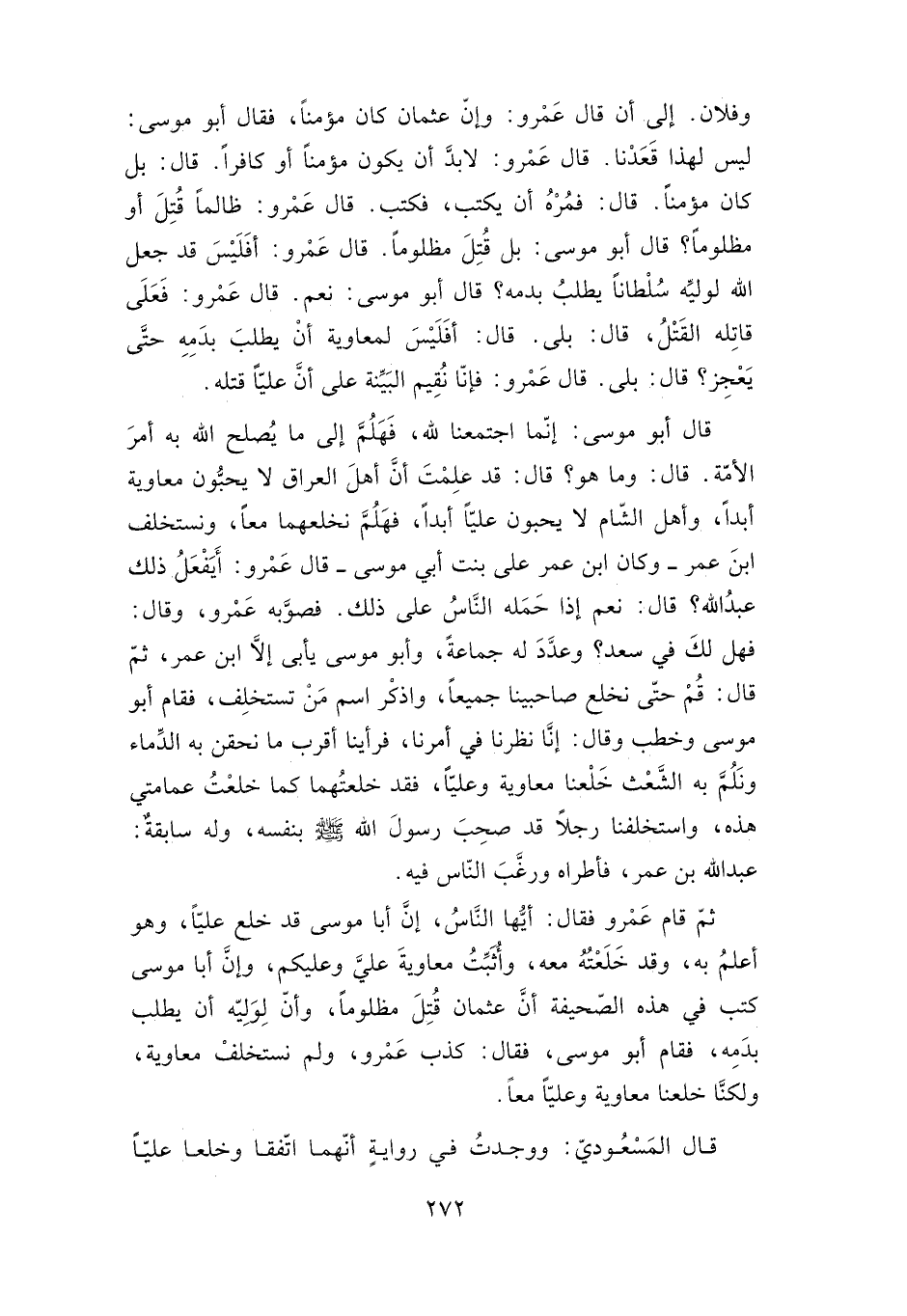 وفلان. إلى أن قال عمرو: وإن عثمان كان مؤمنا، فقال أبو موسى: ليس لهذا قعدنا. قال عمرو: لا بد أن يكون مؤمنا أو كافرا. قال: بل كان مؤمنا. قال: فمر أن يكتب، فكتب. قال عمرو: ظالما قتل أو مظلومًا؟ قال أبو موسى: بل قتل مظلومًا. قال عمرو: أفليس قد جعل الله لوليه سلطانا يطلب بدمه؟ قال أبو موسى: نعم قال عمرو: فعلى قاتله القتل، قال: بلى قال: أفليس لمعاوية أن يطلب بدمه حتى يعجز؟ قال: بلى قال عمرو: فإنا نقيم البينة على أن عليا قتله.