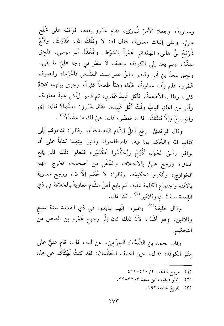 ومعاوية، وجعلا الأمر شورى، فقام عمرو بعده، فوافقه على خلع علي، وعلى إثبات معاوية، فقال له: لا وفقك الله، غدرت وقنع شريح بن هانئ الهمداني عمرا بالسوط. وانخذل أبو موسى، فلحق بمكة، ولم يعد إلى الكوفة، وحلف لا ينظر في وجه علي ما بقي. ولحق سعد بن أبي وقاص وابن عمر ببيت المقدس فأحرما، وانصرف عمرو، فلم يأت معاوية، فأتاه وهيأ طعاما كثيرا، وجرى بينهما كلام كثير، وطلب الأطعمة، فأكل عبيد عمرو، ثم قاموا ليأكل عبيد معاوية، وأمر من أغلق الباب وقت أكل عبيده، فقال عمرو: فعلتها؟ قال: إي والله بايع وإلا قتلتك.