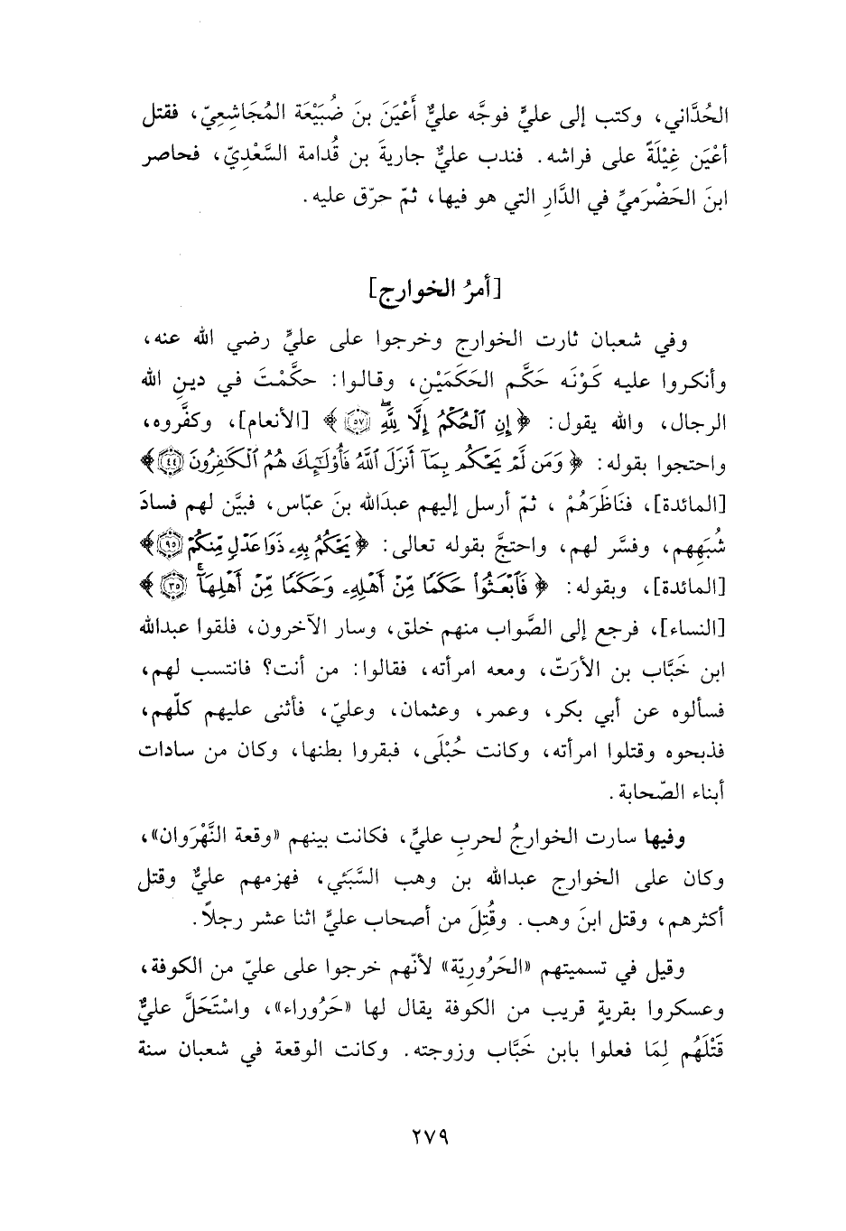 وفي شعبان: ثارت الخوارج وخرجوا على علي رضي الله عنه، وأنكروا عليه كونه حكم الحكمين، وقالوا: حكمت في دين الله الرجال، والله يقول: {إِنِ الْحُكْمُ إِلَّا لِلَّه} [الأنعام: 57] ، وكفروه، واحتجوا بقوله: {وَمَنْ لَمْ يَحْكُمْ بِمَا أَنْزَلَ اللَّهُ فَأُولَئِكَ هُمُ الْكَافِرُونَ} [المائدة: 44] ، فناظرهم، ثم أرسل إليهم عبد الله بن عباس، فبين لهم فساد شبههم، وفسر لهم، واحتج بقوله تعالى: {يَحْكُمُ بِهِ ذَوَا عَدْلٍ مِنْكُم} [المائدة: 95] ، وبقوله: {فَابْعَثُوا حَكَمًا مِنْ أَهْلِهِ وَحَكَمًا مِنْ أَهْلِهَا} [النساء: 35] ، فرجع إلى الصواب منهم خلق، وسار الآخرون، فلقوا عبد الله بن خباب بن الأرت، ومعه امرأته، فقالوا: من أنت؟ فانتسب لهم، فسألوه عن أبي بكر، وعمر، وعثمان، وعلي، فأثنى عليهم كلهم، فذبحوه وقتلوا امرأته، وكانت حبلى، فبقروا بطنها، وكان من سادات أبناء الصحابة.