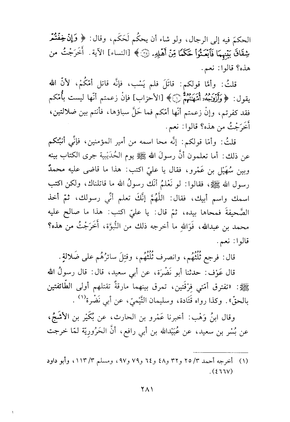 قلت: وأما قولكم: إنه محا اسمه من أمير المؤمنين، فإني أنبئكم عن ذلك: أما تعلمون أن رسول الله صلى الله عليه وسلم يوم الحديبية جرى الكتاب بينه وبين سهيل بن عمرو، فقال: "يا علي اكتب: هذا ما قاضى عليه محمد رسول الل هـ -صلى الله عليه وسلم "، فقالوا: لو نعلم أنك رسول الله ما قاتلناك، ولكن اكتب اسمك واسم أبيك، فقال: "اللهم إنك تعلم أني رسولك"، ثم أخذ الصحيفة فمحاها بيده، ثم قال: "يا علي اكتب: هذا ما صالح عليه محمد بن عبد الله"، فوالله ما أخرجه ذلك من النبوة، أخرجت من هذه؟ قالوا: نعم.