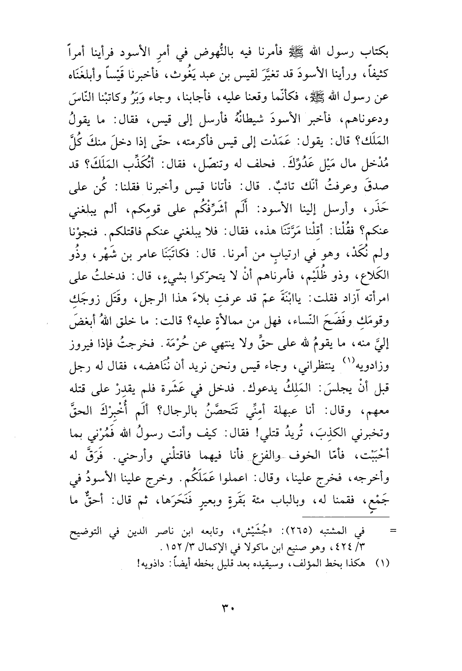 بكتاب رسول الله صلى الله عليه وسلم فأمرنا فيه بالنهوض في أمر الأسود فرأينا أمر كثيفا، ورأينا الأسود قد تغير لقيس بن عبد يغوث، فأخبرنا قيسا وأبلغناه عن رسول الله صلى الله عليه وسلم، فكأنا وقعنا عليه، فأجابنا، وجاء وبر وكاتبنا الناس ودعوناهم، فأخبر الأسود شيطانه فأرسل إلى قيس، فقال: ما يقول الملك؟ قال: يقول: عمدت إلى قيس فأكرمته، حتى إذا دخل منك كل مدخل مال ميل عدوك. فحلف له وتنصل، فقال: أتكذب الملك؟ قد صدق وعرفت أنك تائب. قال: فأتانا قيس وأخبرنا فقلنا: كن على حذر، وأرسل إلينا الأسود: ألم أشرفكم على قومكم، ألم يبلغني عنكم؟ فقلنا: أقلنا مرتنا هذه، فقال: فلا يبلغني عنكم فاقتلكم. فنجونا ولم نكد، وهو في ارتياب من أمرنا. قال: فكاتبنا عامر بن شهر، وذو الكلاع، وذو ظليم، فأمرناهم أن لا يتحركوا بشيء، قال: فدخلت على امرأته آزا