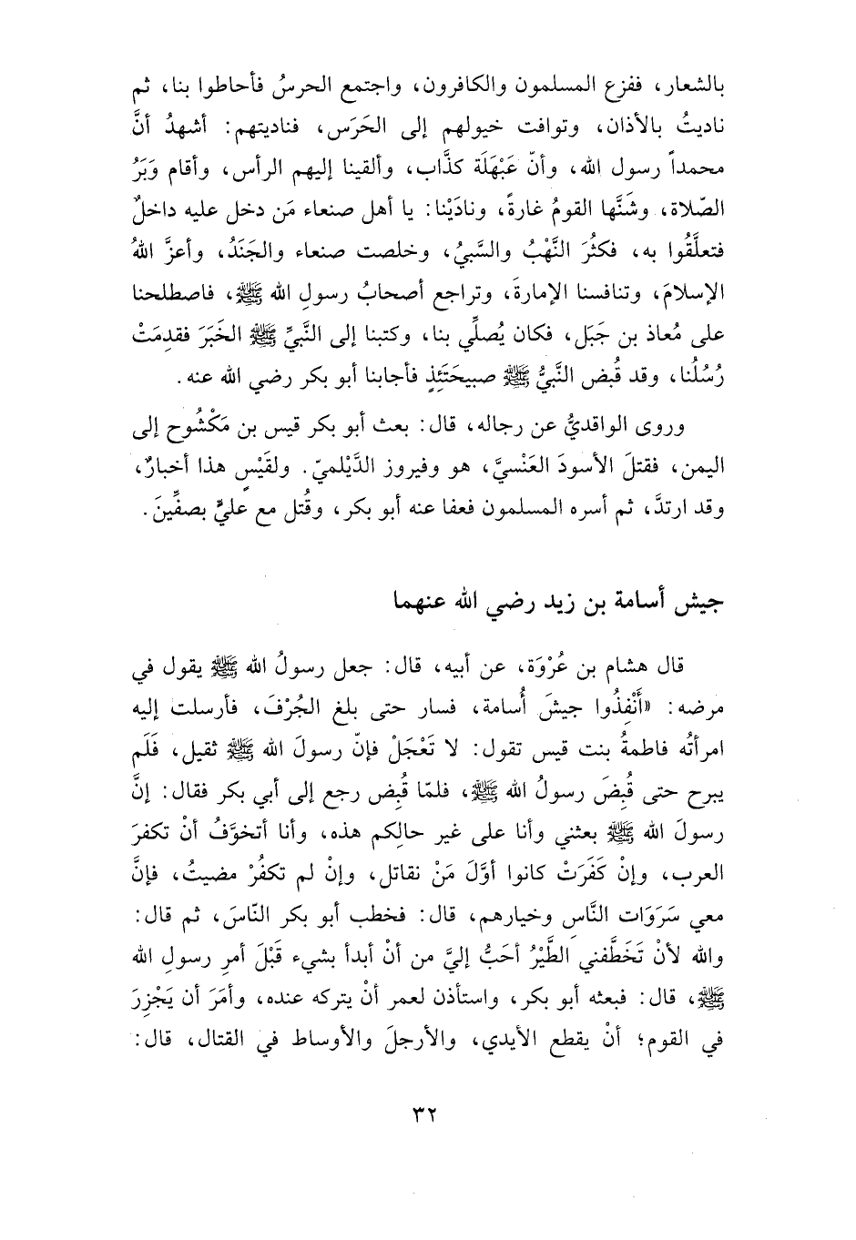 قال هشام بن عروة، عن أبيه، قال: جعل رسول الله صلى الله عليه وسلم يقول في مرضه: "أنفذوا جيش أسامة"، فسار حتى بلغ الجرف، فأرسلت إليه امرأته فاطمة بنت قيس تقول: لا تعجل فإن رسول الله صلى الله عليه وسلم ثقيل، فلم يبرح حتى قبض رسول الله صلى الله عليه وسلم، فلما قبض رجع إلى أبي بكر فقال: إن رسول الله صلى الله عليه وسلم بعثني وأنا على غير حالكم هذه، وأنا أتخوف أن تكفر العرب، وإن كفرت كانوا أول من نقاتل، وإن لم تكفر مضيت، فإن معي سروات الناس وخيارهم، قال: فخطب أبو بكر الناس، ثم قال: والله لأن تخطفني الطير أحب إلي من أن أبدأ بشيء قبل أمر رسول الله صلى الله عليه وسلم، قال: فبعثه أبو بكر، واستأذن لعمر أن يتركه عنده، وأمر أن يجزر في القوم، أن يقطع الأيدي، والأرجل والأوساط في القتال، قال:
