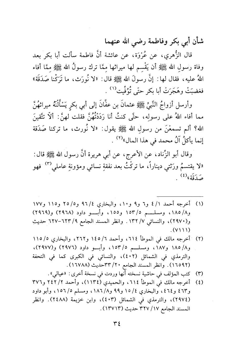 قال الزهري عن عروة، عن عائشة أن فاطمة سألت أبا بكر بعد وفاة رسول الله صلى الله عليه وسلم أن يقسم لها ميراثها مما ترك رسول الله صلى الله عليه وسلم مما أفاء الله عليه، فقال لها: إن رسول الله صلى الله عليه وسلم قال: "لا نورث ما تركنا صدقة". فغضبت وهجرت أبا بكر حتى توفيت.