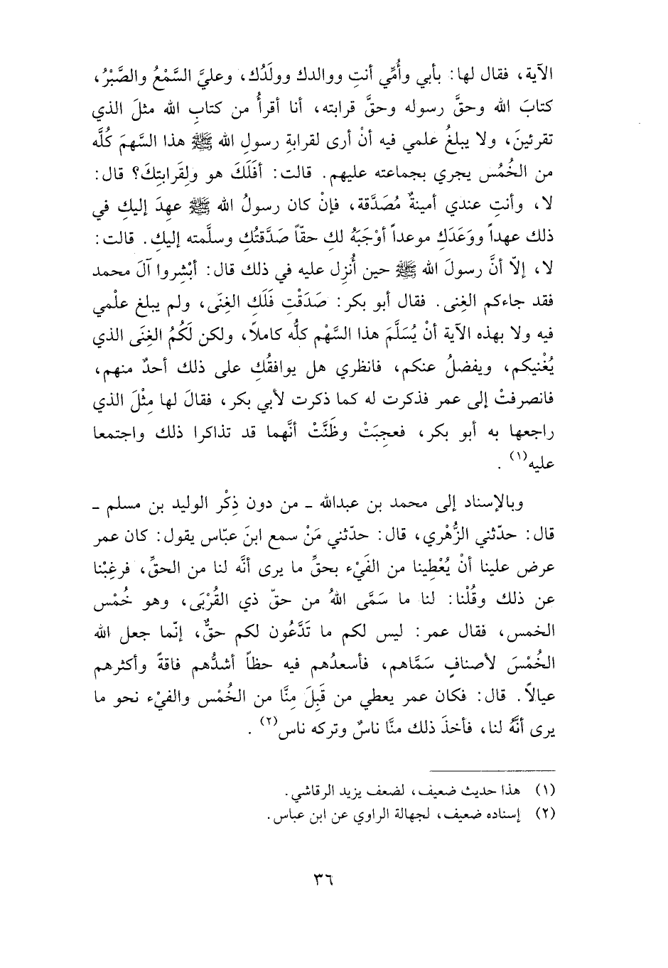 وبالإسناد إلى محمد بن عبد الله -من دون ذكر الوليد بن مسلم- قال: حدثني الزهري، قال: حدثني من سمع ابن عباس يقول: كان عمر عرض علينا أن يعطينا من الفيء بحق ما يرى أنه لنا من الحق، فرغبنا عن ذلك وقلنا: لنا ما سمى الله من حق ذي القربى، وهو خمس