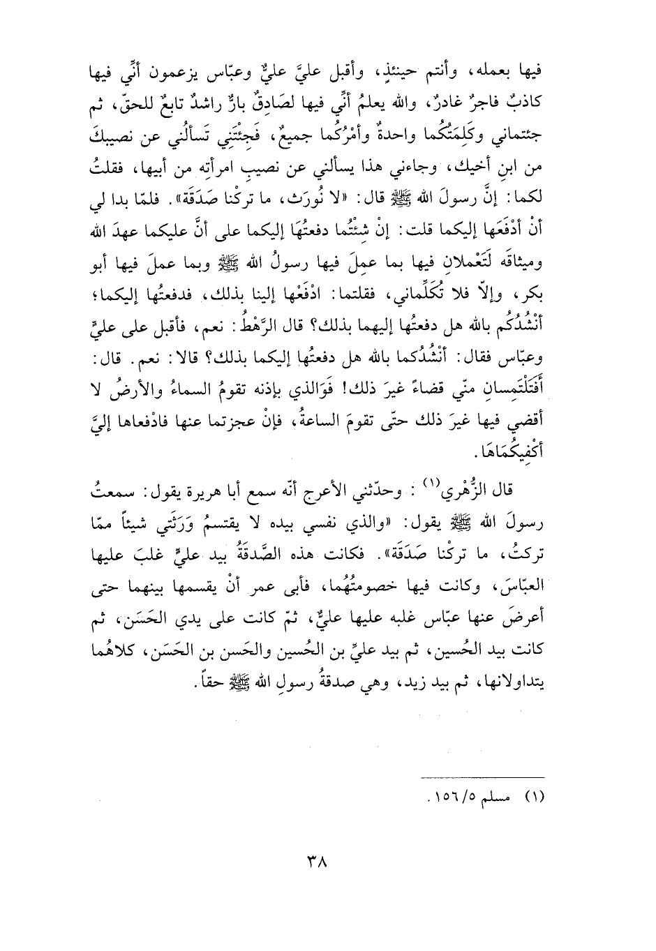 قال الزهري: وحدثني الأعرج أنه سمع أبا هريرة يقول: سمعت رسول الله صلى الله عليه وسلم يقول: "والذي نفسي بيده لا يقتسم ورثتني شيئا مما تركت، ما تركنا صدقة". فكانت هذه الصدقة بيد علي غلب عليها العباس، وكانت فيها خصومتهما، فأبى عمر أن يقسمها بينهما حتى أعرض عنها عباس غلبه عليها علي، ثم كانت على يدي الحسن، ثم كانت بيد الحسين، ثم بيد علي بن الحسين والحسن بن الحسن، كلاهما يتداولانها، ثم بيد زيد، وهي صدقة رسول الله صلى الله عليه وسلم حقا.
