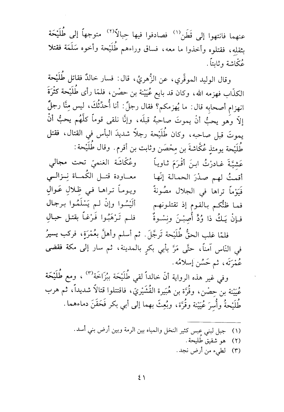 وفي غير هذه الرواية أن خالدا لقي طليحة ببزاخة، ومع طليحة عيينة بن حصن، وقرة بن هبيرة القشيري، فاقتتلوا قتالا شديدا، ثم رب طليحة وأسر عيينة وقرة، وبعث بهما إلى أبي بكر فحقن دماءهما.