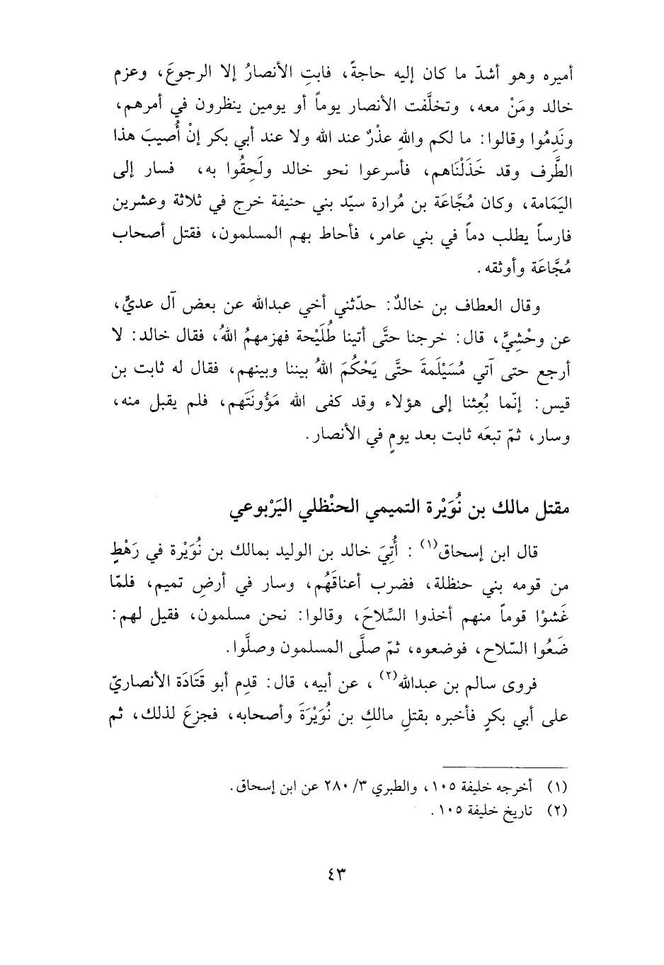 قال ابن إسحاق: أتى خالد بن الوليد بمالك بن نويرة في رهط من قومه بني حنظلة، فضرب أعناقهم، وسار في أرض تميم، فلما غشوا قوما منهم أخذوا السلاح، وقالوا: نحن مسلمون، فقيل لهم: ضعوا السلاح فوضعوه، ثم صلى المسلمون وصلوا.