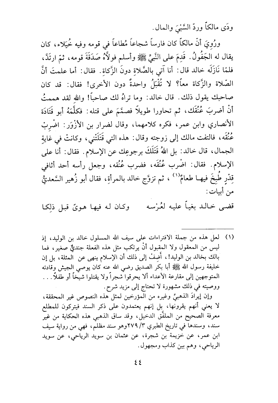 فقال: اضرب عنقه، فضرب عنقه، وجعل رأسه أحد أثافي قدر طبخ فيها طعام، ثم تزوج خالد بالمرأة، فقال أبو زهير السعدي من أبيات: