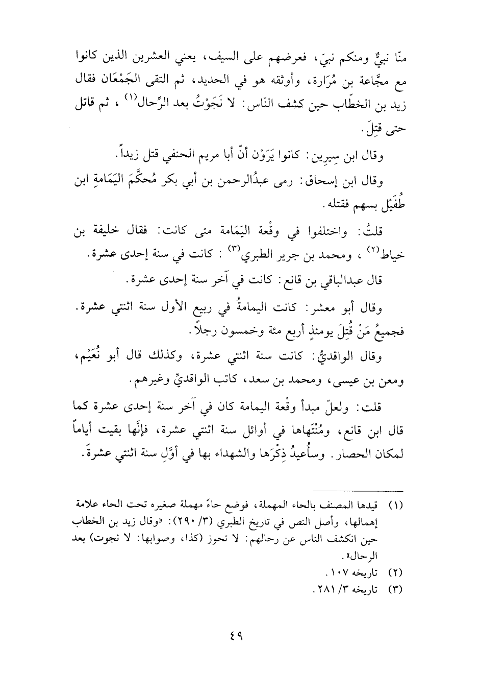 قلت: واختلفوا في وقعة اليمامة متى كانت: فقال خليفة بن خياطن ومحمد بن جرير الطبري: كانت في سنة إحدى عشرة.