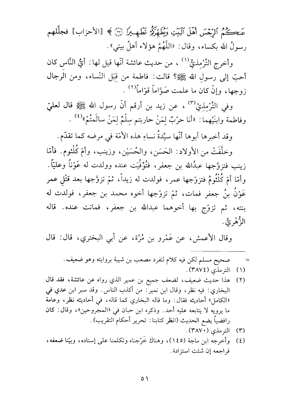عَنْكُمُ الرِّجْسَ أَهْلَ الْبَيْتِ وَيُطَهِّرَكُمْ تَطْهِيرًا} [الأحزاب: 33] ، فجللهم رسول الله بكساء، وقال: "اللهم هؤلاء أهل بيتي". وأخرج الترمذي، من حديث عائشة أنها قيل لها: أي الناس كان أحب إلى رسول الله صلى الله عليه وسلم؟ قالت: فاطمة من قبل النساء، ومن الرجال زوجها، وإن كان ما علمت صواما قواما.