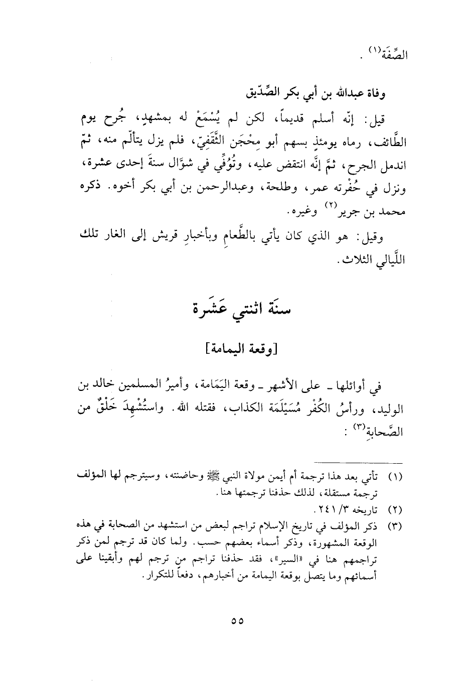 قيل: إنه أسلم قديما، لكن لم يسمع له بمشهد، جرح يوم الطائف، رماه يومئذ بسهم أبو محجن الثقفي، فلم يزل يتألم منه، ثم اندمل الجرح، ثم إنه انتقض عليه، وتوفي في شوال سنة إحدى عشرة، ونزل في حفرته عمر، وطلحة، وعبد الرحمن بن أبي بكر أخوه. ذكره محمد بن جرير وغيره.