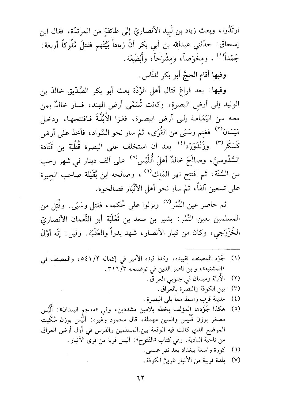 وفيها: بعد فراغ قتال أهل الردة بعث أبو بكر الصديق خالد بن الوليد إلى أرض البصرة، وكانت تسمى أرض الهند، فسار خالد بمن معه من اليمامة إلى أرض البصرة، فغزا الأبلة فافتتحها، ودخل ميسان فغنم وسبى من القرى، ثم سار نحو السواد، فأخذ على أرض كسكر وزندورد بعد أن استخلف على البصرة قطبة بن قتادة السدوسي، وصالح خالد أهل أليس على ألف دينار في شهر رجب من السنة، ثم افتتح نهر الملك، وصالحه ابن بقيلة صاحب الحيرة على تسعين ألفا، ثم سار نحو أهل الأنبار فصالحوه.
