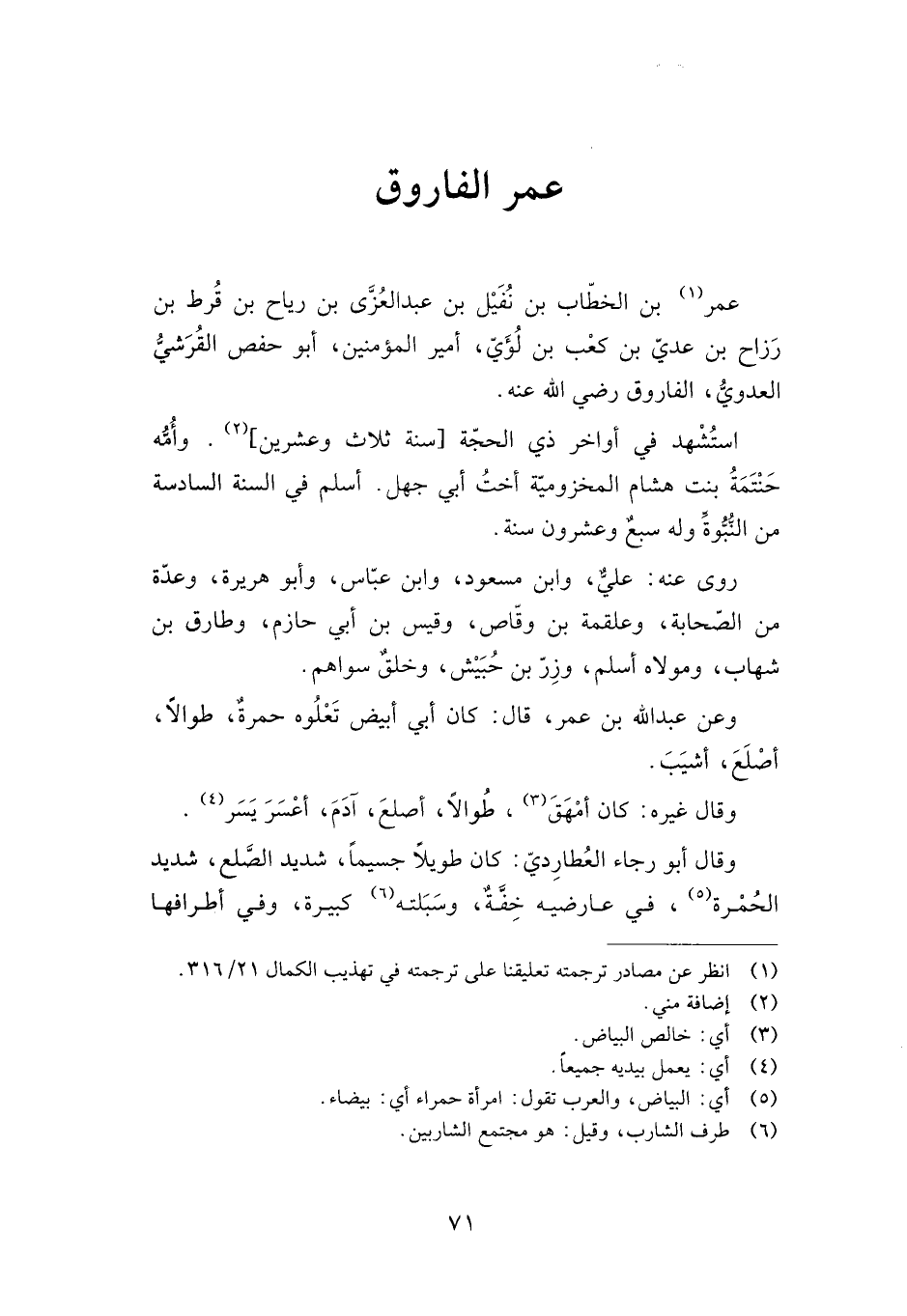 استشهد في أواخر ذي الحجة سنة ثلاث وعشرين. وأمه حنتمة بنت هشام المخزومية أخت أبي جهل. أسلم في السنة السادسة من النبوة وله سبع وعشرون سنة.