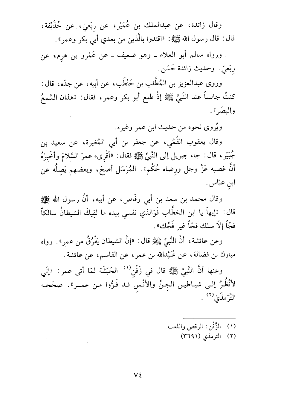 وعنها أن النبي صلى الله عليه وسلم قال في زفن الحبشة لما أتى عمر: "إن لأنظر إلى شياطين الجن والإنس قد فروا من عمر". صححه الترمذي.