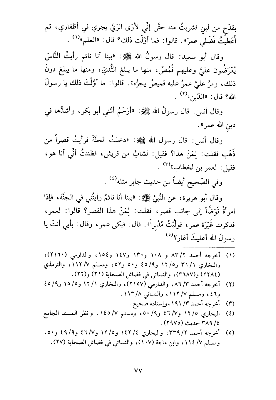 وقال أبو سعيد: قال رسول الله صلى الله عليه وسلم: "بينا أنا نائم رأيت الناس يعرضون علي وعليهم قمص، منها ما يبلغ الثدي، ومنها ما يبلغ دون ذلك، ومر علي عمر عليه قميص يجره".