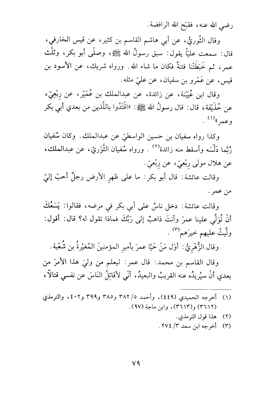 وقال ابن عيينة، عن زائدة، عن عبد الملك بن عميرة، عن ربعي، عن حذيفة قال: قال رسول الله صلى الله عليه وسلم: "اقتدوا باللذين من بعدي أبي بكر وعمر".