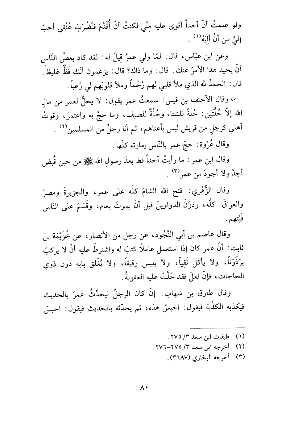 وقال الأحنف بن قيس: سمعت عمر يقول: لا يحل لعمر من مال الله إلا حلتين: حلة للشتاء وحلة للصيف، وما حج به واعتمر، وقوت أهلي كرجل من قريش ليس بأغناهم، ثم أنا رجل من المسلمين.
