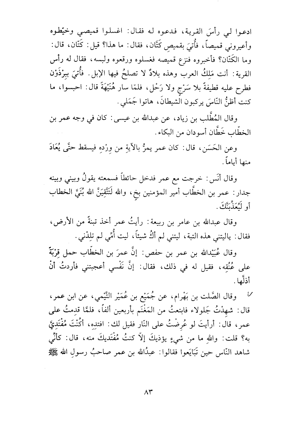 ادعوا لي رأس القرية، فدعوه له فقال: اغسلوا قميصي وخيطوه وأعيروني قميصا، فأتى بقميص كتان، فقال: ما هذا؟ قيل: كتان قال: وما الكتان؟ فأخبروه فنزع قميصه فغسلوه ورقعوه ولبسه، فقال له رأس القرية: أنت ملك العرب وهذ بلاد لا تصلح فيها الإبل. فأتى ببرذون فطرح عليه قطيفة بلا سرج ولا رحل، فلما سار هنيهة قال: احبسوا، ما كانت أظن الناس يركبون الشيطان، هاتوا جملي.