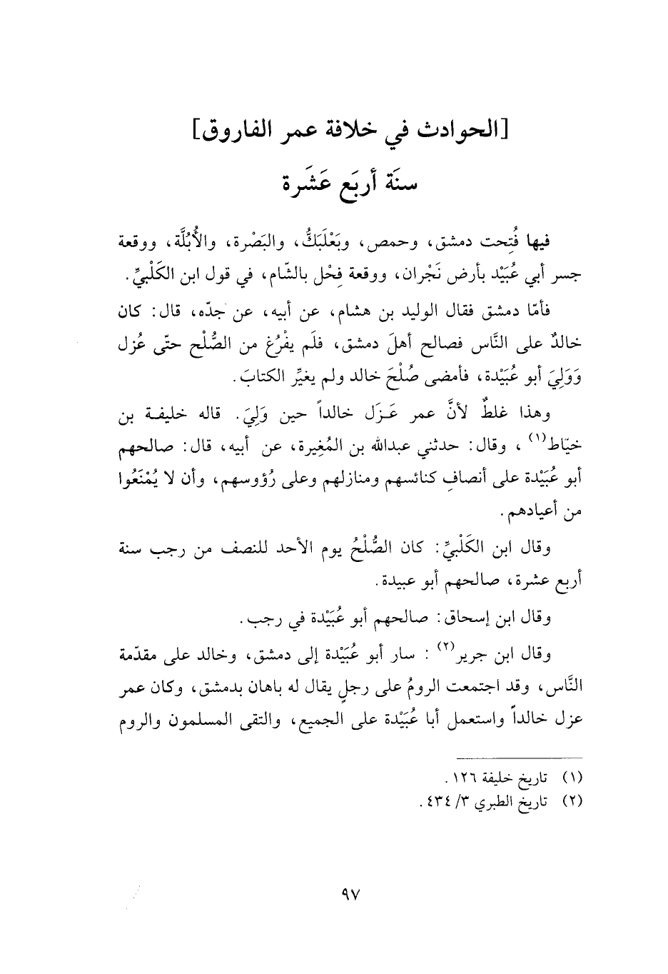 فيها فتحت دمشق، وحمص، وبعلبك، والبصرة، والأبلة، ووقعة جسر أبي عبيد بأرض نجران، ووقعة فحل بالشام، في قول ابن الكلبي.