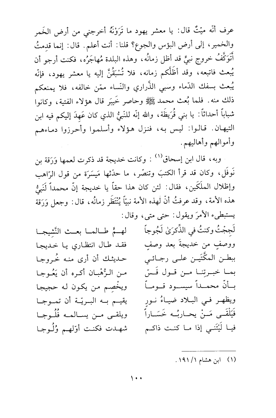عرف أنه ميت قال: يا معشر يهود ما ترونه أخرجني من أرض الخمر والخمير، إلى أرض البؤس والجوع؟ قلنا: أنت أعلم. قال: إنما قدمت أتوكف خروج نبي قد أظل زمانه، وهذه البلدة مهاجره، كنت أرجو أن يبعث فأتبعه، وقد أظلكم زمانه، فلا تسبقن إليه يا معشر يهود، إنه يبعث بسفك الدماء وسبي الذراري والنساء ممن خالفه، فلا يمنعكم ذلك منه. فلما بعث محمد صلى الله عليه وسلم وحاصر خيبر قال هؤلاء الفتية، وكانوا شبابا أحداثا: يا بني قريظة، والله إنه للنبي الذي كان عهد إليكم فيه ابن التيهان. قالوا: ليس به فنزل هؤلاء وأسلموا وأحرزوا دماءهم وأموالهم وأهاليهم.