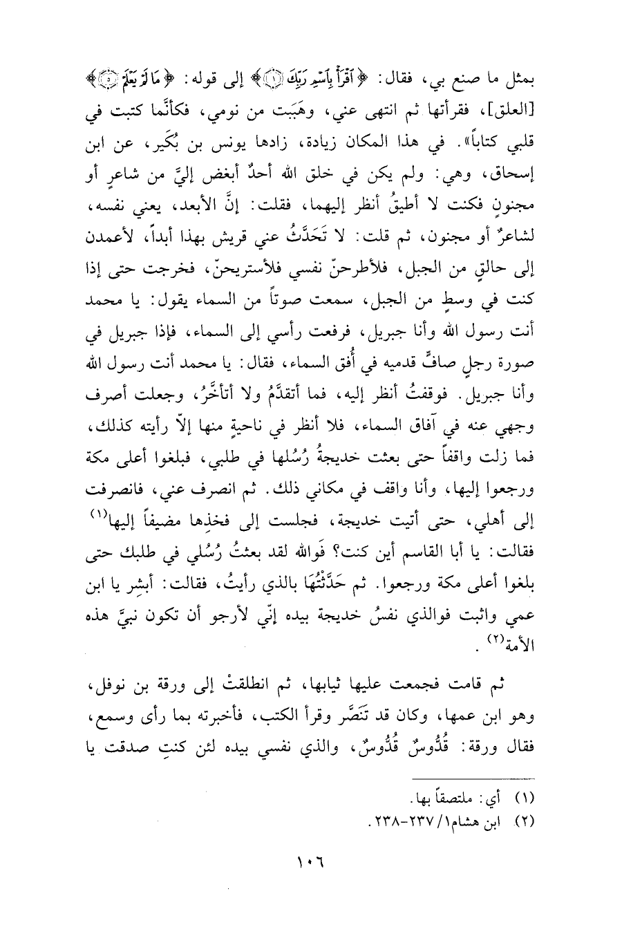 بمثل ما صنع بي فقال: {اقْرَأْ بِاسْمِ رَبِّكَ} إلى قوله: {مَا لَمْ يَعْلَمْ} [العلق: 1-5] ، فقرأتها ثم انتهى عني، وهببت من نومي، فكأنما كتبت في قلبي كتابا". في هذا المكان زيادة، زادا يونس بن بكير، عن ابن إسحاق، وهي: "ولم يكن في خلق الله أحد أبغض إليّ من شاعر أو مجنون فكنت لا أطيق أنظر إليهما، فقلت: إن الأبعد -يعني نفسه- لشاعر أو مجنون، ثم قلت: لا تحدث عني قريش بهذا أبدا، لأعمدن إلى حالق من الجبل فلأطرحن نفسي فلأستريحن، فخرجت حتى إذا كنت في وسط من الجبل، سمعت صوتا من السماء يقول: يا محمد أنت رسول الله وأنا جبريل، فرفعت رأسي إلى السماء، فإذا جبريل في صورة رجل صاف قدميه في أفق السماء، فقال: يا محمد أنت رسول الله وأنا جبريل. فوقفت أنظر إليه، فما أتقدم ولا أتأخر، وجعلت أصرف وجهي عنه في آفاق السماء، فلا أنظر في ناحية منها إلا رأيته كذلك، فما زلت واقفا حتى بعثت خديجة رسلها في طلبي، فبلغوا أعلى مكة ورجعوا إليها، وأنا واقف في مكاني ذلك. ثم انصرف عني، فانصرفت إلى أهلي، حتى أتيت خديجة، فجلست إلى فخذها مضيفا إليها فقالت: يا أبا القاسم أين كنت؟ فوالله لقد بعثت رسلي في طلبك حتى بلغوا أعلى مكة ورجعوا. ثم حدثتها بالذي رأيت، فقالت: أبشر يابن عمي واثبت فوالذي نفس خديجة بيده إني لأرجو أن تكون نبي هذه الأمة".
