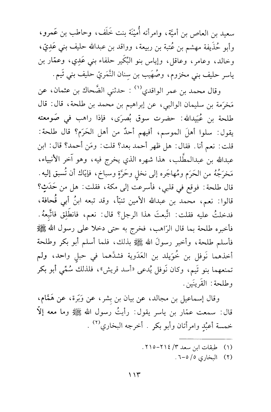 وقال محمد بن عمر الواقدي: حدثني الضحاك بن عثمان، عن مخرمة بن سليمان الوالبي، عن إبراهيم بن محمد بن طلحة، قال: قال طلحة بن عبيد الله: حضرت سوق بصرى، فإذا راهب في صومعته يقول: سلوا أهل الموسم، أفيهم أحد من أهل الحرم؟ قال طلحة: قلت: نعم أنا. فقال: هل ظهر أحمد بعد؟ قلت: ومن أحمد؟ قال: ابن عبد الله بن عبد المطلب، هذا شهره الذي يخرج فيه، وهو آخر الأنبياء، مخرجه من الحرم ومهاجره إلى نخل وحرة وسباخ، فإياك أن تسبق إليه. قال طلحة: فوقع في قلبي، فأسرعت إلى مكة، فقلت: هل من حدث؟ قالوا: نعم، محمد بن عبد الله الأمين تنبأ، وقد تبعه ابن أبي قحافة، فدخلت عليه فقلت: اتبعت هذا الرجل؟ قال: نعم، فانطلق فاتبعه. فأخبره طلحة بما قال الراهب، فخرج به حتى دخلا على رسول الله صلى الله عليه وسلم فأسلم طلحة، وأخبر رسول الله صلى الله عليه وسلم بذلك، فلما أسلم أبو بكر وطلحة أخذهما نوفل بن خويلد بن العدوية فشدهما في حبل واحد، ولم تمنعهما بنو تيم، وكان نوفل يدعى "أسد قريش"، فلذلك سمي أبو بكر وطلحة: القرينين.