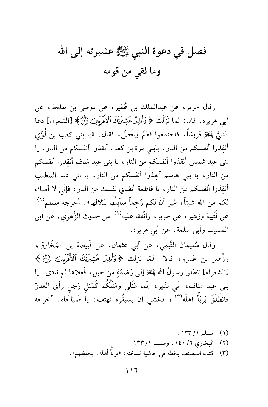 وقال سليمان التيمي، عن أبي عثمان، عن قبيصة بن المخارق، وزهير بن عمرو، قالا: لما نزلت: {وَأَنْذِرْ عَشِيرَتَكَ الْأَقْرَبِينَ} [الشعراء: 214] ، انطلق رسول الله صلى الله عليه وسلم إلى رضمة من جبل، فعلاها ثم نادى: "يا بني عبد مناف، إني نذير، إنما مثلي ومثلكم كمثل رجل رأى العدو فانطلق يربأ أهله، فخشي أن يسبقوه فهتف: يا صباحاه". أخرجه