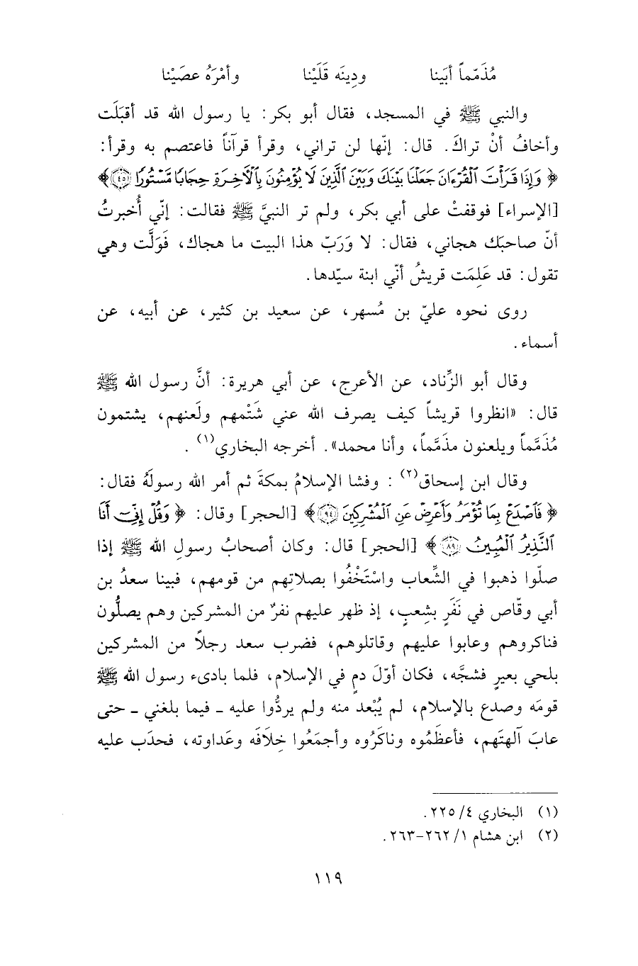 وقال ابن إسحاق: وفشا الإسلام بمكة ثم أمر الله رسوله فقال: {فَاصْدَعْ بِمَا تُؤْمَرُ وَأَعْرِضْ عَنِ الْمُشْرِكِينَ} [الحجر: 94] ، وقال: {وَقُلْ إِنِّي أَنَا النَّذِيرُ الْمُبِينُ} [الحجر: 89] قال: وكان أصحاب رسول الله صلى الله عليه وسلم إذا صلوا ذهبوا في الشعاب واستخفوا بصلاتهم من قومهم، فبينا سعد بن أبي وقاص في نفر بشعب، إذ ظهر عليهم نفر من المشركين وهم يصلون فناكروهم وعابوا عليهم وقاتلوهم، فضرب سعد رجلا من المشركين بلحي بعير فشجه، فكان أول دم في الإسلام، فلما بادأ رسول الله صلى الله عليه وسلم قومه وصدع بالإسلام، لم يبعد منه ولم يردوا عليه -فيما بلغني- حتى عاب آلهتهم، فأعظموه وناكروه وأجمعوا خلافه وعداوته، فحدب عليه