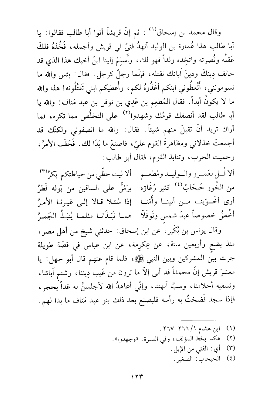 الوليد أنهد فتى في قريش وأجمله، فخذه فلك عقله ونصرته واتخذه ولدا فهو لك، وأسلم إلينا ابن أخيك هذا الذي قد خالف دينك ودين آبائك نقتله، فإنما رجل كرجل. فقال: بئس والله ما تسومونني، أتعطوني ابنكم أغذوه لكم، وأعطيكم ابني تقتلونه! هذا والله ما لا يكون أبدا. فقال المطعم بن عدي بن نوفل بن عبد مناف: والله يا أبا طالب لقد أنصفك قومك وشهدوا على التخلص مما تكره، فما أراك تريد أن تقبل منهم شيئا. فقال: والله ما أنصفوني ولكنك قد أجمعت خذلاني ومظاهرة القوم عليّ، فاصنع ما بدا لك. فحقب الأمر، وحميت الحرب، وتنابذ القوم، فقال أبو طالب: