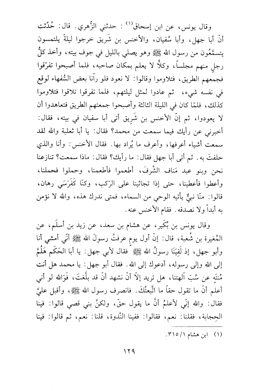 فجمعهم الطريق، فتلاوموا وقالوا: لا نعود فلو رآنا بعض السفهاء لوقع في نفسه شيء، ثم عادوا لمثل ليلتهم، فلما تفرقوا تلاقوا فتلاوموا كذلك، فلما كان في الليلة الثالثة وأصبحوا جمعتهم الطريق فتعاهدوا أن لا يعودوا، ثم إن الأخنس بن شريق أتى أبا سفيان في بيته، فقال: أخبرني عن رأيك فيما سمعت من محمد؟ فقال: يا أبا ثعلبة والله لقد سمعت أشياء أعرفها، وأعرف ما يراد بها. فقال الأخنس: وأنا والذي حلفت به. ثم أتى أبا جهل فقال: ما رأيك؟ فقال: ماذا سمعت؟ تنازعنا نحن وبنو عبد مناف الشرف، أطعموا فأطعمنا، وحملوا فحملنا، وأعطوا فأعطينا، حتى إذا تجاثينا على الركب، وكنا كفرسي رهان، قالوا: منا نبي يأتيه الوحي من السماء، فمتى ندرك هذه، والله لا نؤمن به أبدا ولا نصدقه. فقام الأخنس عنه.