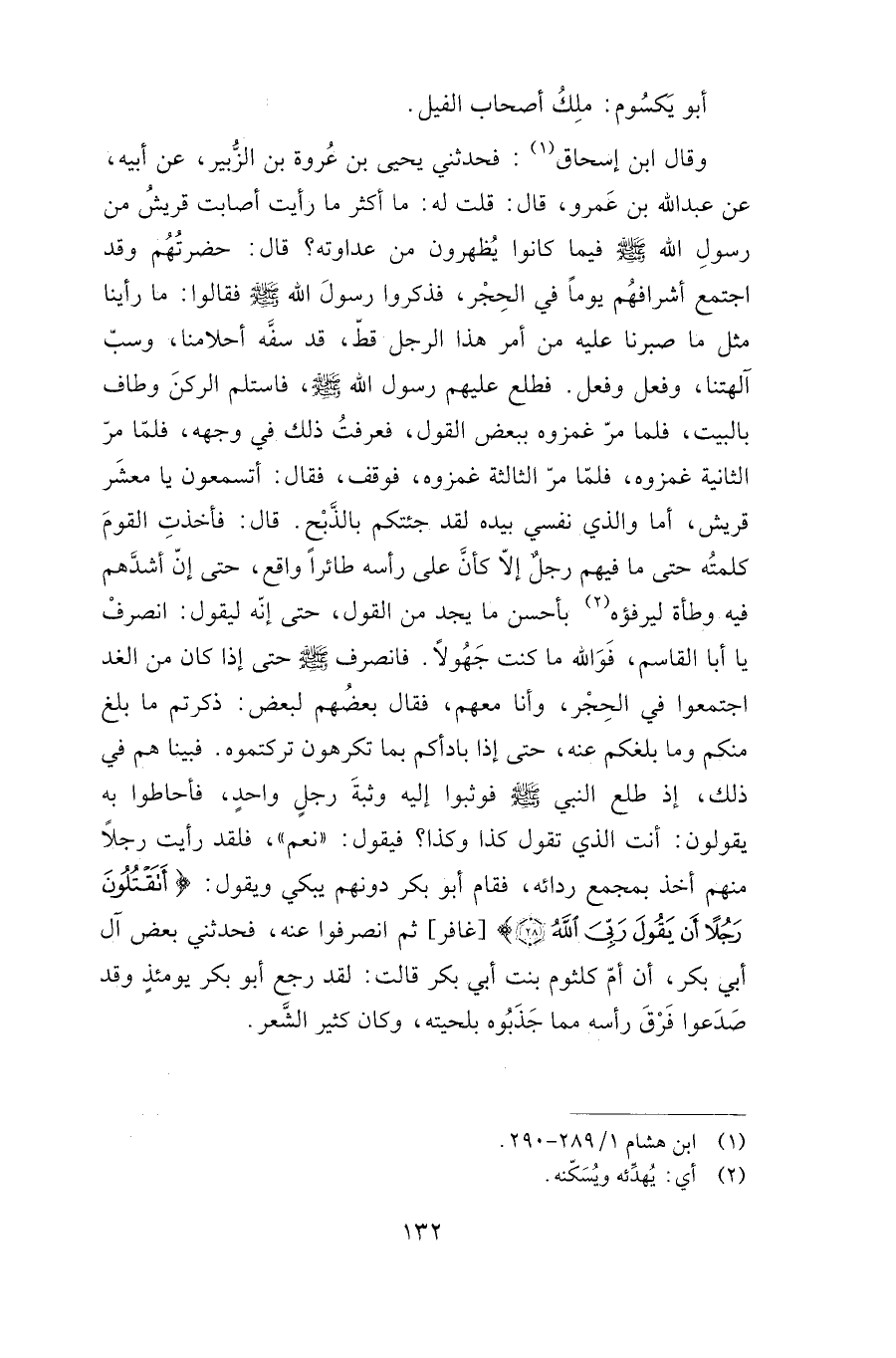 وقال ابن إسحاق: فحدثني يحيى بن عروة بن الزبير، عن أبيه، عن عبد الله بن عمرو، قال: قلت له: ما أكثر ما رأيت أصابت قريش من رسول الله صلى الله عليه وسلم فيما كانوا يظهرون من عداوته؟ قال: حضرتهم وقد اجتمع أشرافهم يوما في الحجر, فذكروا رسول الله صلى الله عليه وسلم فقالوا: ما رأينا مثل ما صبرنا عليه من أمر هذا الرجل قط، قد سفه أحلامنا، وسب آلهتنا, وفعل وفعل. فطلع عليهم رسول الله صلى الله عليه وسلم، فاستلم الركن وطاف بالبيت، فلما مر غمزوه ببعض القول، فعرفت ذلك في وجهه، فلما مر الثانية غمزوه، فلما مر الثالثة غمزوه، فوقف, فقال: "أتسمعون يا معشر قريش، أما والذي نفسي بيده لقد جئتكم بالذبح". قال: فأخذت القوم كلمته حتى ما فيهم رجل إلا كأن على رأسه طائرا واقع، حتى إن أشدهم فيه وطأة ليرفؤه بأحسن ما يجد من القول، حتى إنه ليقول: انصرف يا أبا القاسم، فوالله ما كنت جهولا. فانصرف صلى الله عليه وسلم حتى إذا كان من الغد اجتمعوا في الحجر، وأنا معهم، فقال بعضهم لبعض: ذكرتم ما بلغ منكم وما بلغكم عنه، حتى إذا بادأكم بما تكرهون تركتموه. فبينا هم في ذلك، إذ طلع النبي صلى الله عليه وسلم فوثبوا إليه وثبة رجل واحد، فأحاطوا به يقولون: أنت الذي تقول كذا وكذا؟ فيقول: "نعم". فلقد رأيت رجلا منهم أخذ بمجمع ردائه، فقام أبو بكر دونهم يبكي ويقول: {أَتَقْتُلُونَ رَجُلًا أَنْ يَقُولَ رَبِّيَ اللَّهُ} [غافر: 28] ، ثم انصرفوا عنه، فحدثني بعض آل أبي بكر، أن أم كلثوم بنت أبي بكر قالت: لقد رجع أبو بكر يومئذ وقد صدعوا فرق رأسه مما جذبوه بلحيته، وكان كثير الشعر.