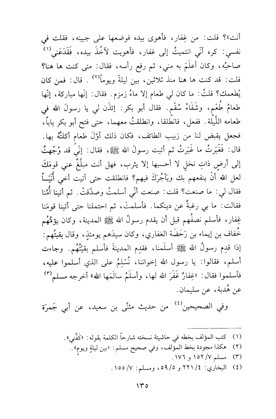 أنت؟ " قلت: من غفار، فأهوى بيده فوضعها على جبينه فقلت في نفسي: كره أني انتميت إلى غفار، فأهويت لآخذ بيده، فقدعني صاحبه، وكان أعلم به مني, ثم رفع رأسه، فقال: "متى كنت ههنا؟ " قلت: قد كنت ههنا منذ ثلاثين بين ليلة ويوما. قال: "فمن كان يطعمك؟ " قلت: ما كان لي طعام إلا ماء زمزم. فقال: "إنها مباركة، إنها طعام طعم، وشفاء سقم". فقال أبو بكر: ائذن لي يا رسول الله في طعامه الليلة. ففعل، فانطلقا، وانطلقت معهما، حتى فتح أبو بكر بابا، فجعل يقبض لنا من زبيب الطائف، فكان ذلك أول طعام أكلته بها. قال: فغبرت ما غبرت ثم أتيت رسول الله صلى الله عليه وسلم، فقال: "إني قد وجهت إلى أرض ذات نخل لا أحسبها إلا يثرب، فهل أنت مبلغ عني قومك لعل الله أن ينفعهم بك ويأجرك فيهم؟ ". فانطلقت حتى أتيت أخي أنيسا فقال لي: ما صنعت؟ قلت: صنعت أني أسلمت وصدقت. ثم أتينا أمنا فقالت: ما بي رغبة عن دينكما. فأسلمت، ثم احتملا حتى أتينا قومنا غفار، فأسلم نصفهم قبل أن يقدم رسول الله صلى الله عليه وسلم المدينة، وكان يؤمهم خفاف بن إيماء بن رحضة الغفاري، وكان سيدهم يومئذ، وقال بقيتهم: إذا قدم رسول الله صلى الله عليه وسلم أسلمنا، فقدم المدينة فأسلم بقيتهم. وجاءت أسلم فقالوا: يا رسول الله إخواننا، نسلم على الذي أسلموا عليه، فأسلموا فقال: "غفار غفر الله لها، وأسلم سالمها الله". أخرجه مسلم عن هدبة، عن سليمان.