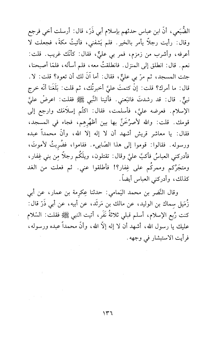 حدثهم بإسلام أبي ذر، قال: أرسلت أخي فرجع وقال: رأيت رجلا يأمر بالخير. فلم يشفني, فأتيت مكة، فجعلت لا أعرفه، وأشرب من زمزم، فمر بي عليٌّ، فقال: كأنك غريب. قلت: نعم قال: انطلق إلى المنزل فانطلقت معه، فلم أسأله، فلما أصبحنا، جئت المسجد، ثم مر بي عليٌّ، فقال: أما آن لك أن تعود؟ قلت: لا. قال: ما أمرك؟ قلت: إن كتمت عليَّ أخبرتك, ثم قلت: بلغنا أنه خرج نبي. قال: قد رشدت فاتبعني. فأتينا النبي صلى الله عليه وسلم فقلت: اعرض عليَّ الإسلام. فعرضه عليَّ، فأسلمت، فقال: اكتم إسلامك وارجع إلى قومك. قلت: والله لأصرخن بها بين أظهرهم، فجاء في المسجد, فقال: يا معاشر قريش أشهد أن لا إله إلا الله، وأن محمدا عبده ورسوله. فقالوا: قوموا إلى هذا الصابئ فقاموا، فضربت لأموت، فأدركني العباس فأكب عليَّ وقال: تقتلون، ويلكم رجلا من بني غفار، ومتجركم وممركم على غفار؟! فأطلقوا عني. ثم فعلت من الغد كذلك، وأدركني العباس أيضا.