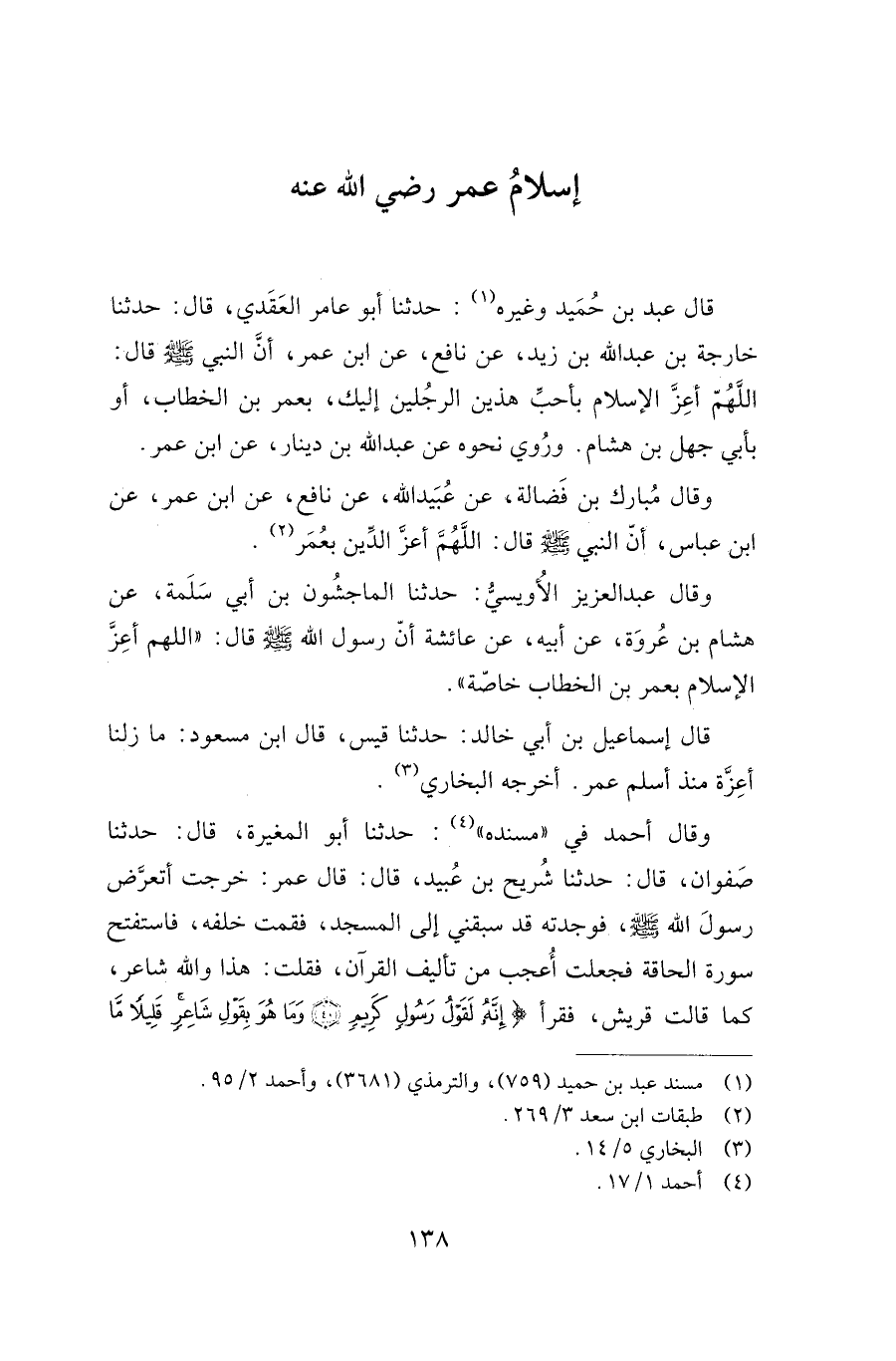 قال عبد بن حميد وغيره: حدثنا أبو عامر العقدي، قال: حدثنا خارجة بن عبد الله بن زيد، عن نافع، عن ابن عمر، أن النبي صلى الله عليه وسلم قال: "اللهم أعز الإسلام بأحب هذين الرجلين إليك: بعمر بن الخطاب، أو بأبي جهل بن هشام". وروى نحوه عن عبد الله بن دينار، عن ابن عمر.
