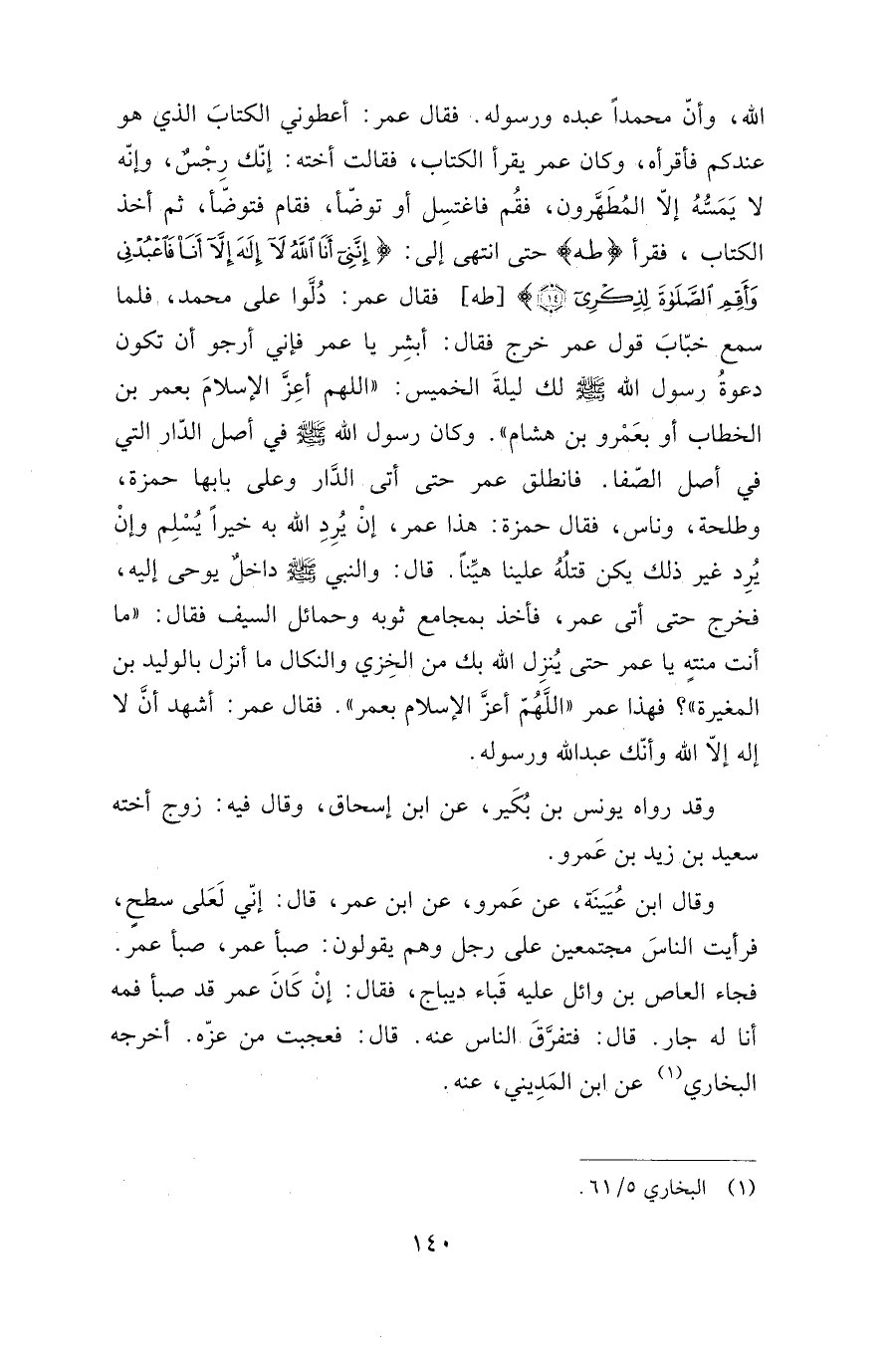 وقال ابن عيينة، عن عمرو، عن ابن عمر، قال: إني لعلى سطح، فرأيت الناس مجتمعين على رجل وهم يقولون: صبأ عمر، صبأ عمر. فجاء العاص بن وائل عليه قباء ديباج، فقال: إن كان عمر قد صبأ فمه أنا له جار. قال فتفرق الناس عنه. قال: فعجبت من عزه. أخرجه البخاري عن ابن المديني، عنه.