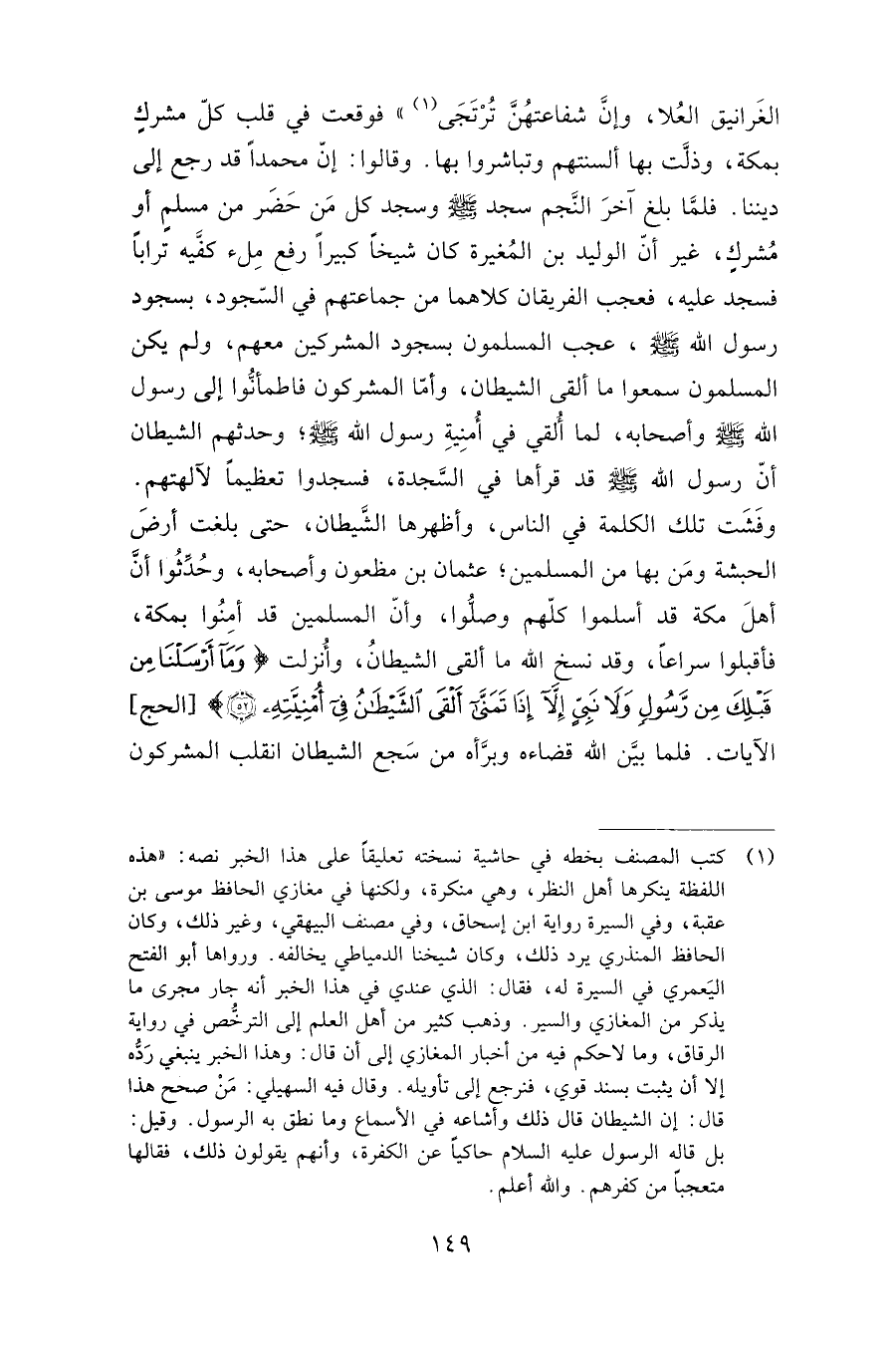 ألسنتهم وتباشروا بها. وقالوا: إن محمدا قد رجع إلى ديننا. فلما بلغ آخر النجم سجد صلى الله عليه وسلم وسجد كل من حضر من مسلم أو مشرك، غير أن الوليد بن المغيرة كان شيخا كبيرا رفع ملء كفيه ترابا فسجد عليه، فعجب الفريقان كلاهما من جماعتهم في السجود، بسجود رسول الله صلى الله عليه وسلم، عجب المسلمون بسجود المشركين معهم، ولم يكن المسلمون سمعوا ما ألقى الشيطان، وأما المشركون فاطمأنوا إلى رسول الله صلى الله عله وسلم وأصحابه، لما ألقى في أمنية رسول الله صلى الله عليه وسلم؛ وحدثهم الشيطان أن رسول الله صلى الله عليه وسلم قد قرأها في السجدة، فسجدوا تعظيما لآلهتهم.