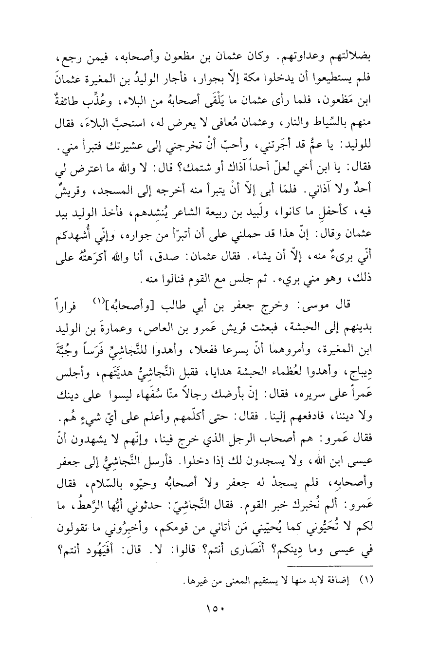 قال موسى: وخرج جعفر بن أبي طالب وأصحابه فرارا بدينهم إلى الحبشة، فبعثت قريش عمرو بن العاص، وعمارة بن الوليد ابن المغيرة، وأمروهما أن يسرعا ففعلا، وأهدوا للنجاشي فرسا وجبة ديباج، وأهدوا لعظماء الحبشة هدايا، فقبل النجاشي هديتهم، وأجلس عمرا على سريره، فقال: إن بأرضك رجالا منا سفهاء ليسوا على دينك ولا ديننا، فادفعهم إلينا. فقال: حتى أكلمهم وأعلم على أي شيء هم. فقال عمرو: هم أصحاب الرجل الذي خرج فينا، وإنهم لا يشهدون أن عيسى ابن الله، ولا يسجدون لك إذا دخلوا. فأرسل النجاشي إلى جعفر وأصحابه، فلم يسجد له جعفر ولا أصحابه وحيوه بالسلام، فقال عمرو: ألم نخبرك خبر القوم. فقال النجاشي: حدثوني أيها الرهط، ما لكم لا تحيوني كما يحييني من أتاني من قومكم؟ وأخبروني ما تقولون في عيسى وما دينكم؟ أنصارى أنتم؟ قالوا: لا. قال: أفيهود أنتم؟