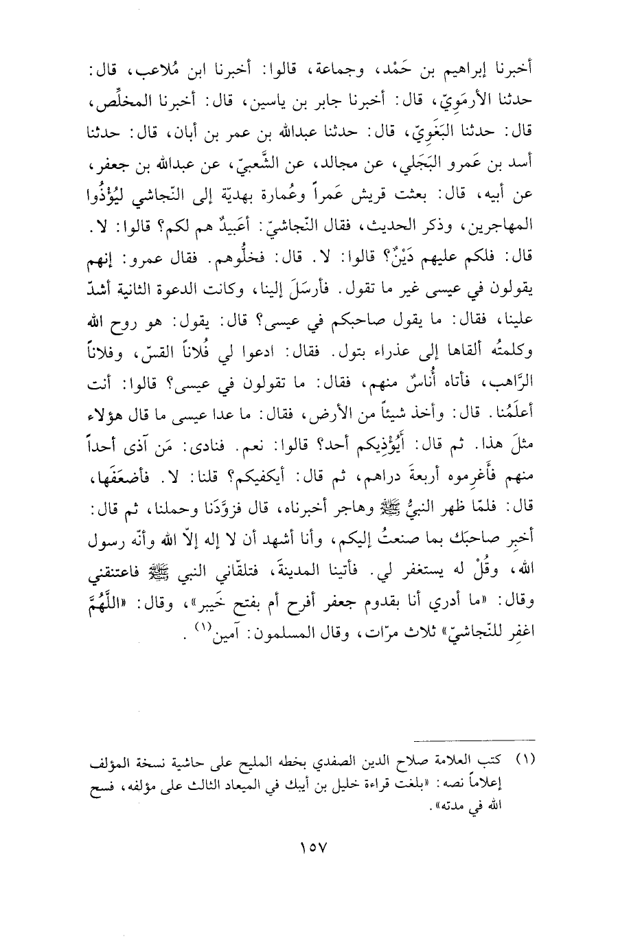 أخبرنا إبراهيم بن حمد، وجماعة، قالوا: أخبرنا ابن ملاعب، قال: حدثنا الأرموي، قال: أخبرنا جابر بن ياسين، قال: أخبرنا المخلص، قال: حدثنا البغوي، قال: حدثنا عبد الله بن عمر بن أبان، قال: حدثنا أسد بن عمرو البجلي، عن مجالد، عن الشعبي، عن عبد الله بن جعفر, عن أبيه، قال: بعثت قريش عمرا وعمارة بهدية إلى النجاشي ليؤذوا المهاجرين، وذكر الحديث، فقال النجاشي: أعبيد هم لكم؟ قالوا: لا. قال: فلكم عليهم دين؟ قالوا: لا. قال: فخلوهم فقال عمرو: إنهم يقولون في عيسى غير ما تقول فأرسل إلينا، وكانت الدعوة الثانية أشد علينا، فقال: ما يقول صاحبكم في عيسى؟ قال: يقول هو روح الله وكلمته ألقاها إلى عذراء بتول. فقال: ادعوا لي فلانا القس، وفلانا الراهب، فأتاه أناس منهم، فقال: ما تقولون في عيسى؟ قالوا: أنت أعلمنا. قال: وأخذ شيئا من